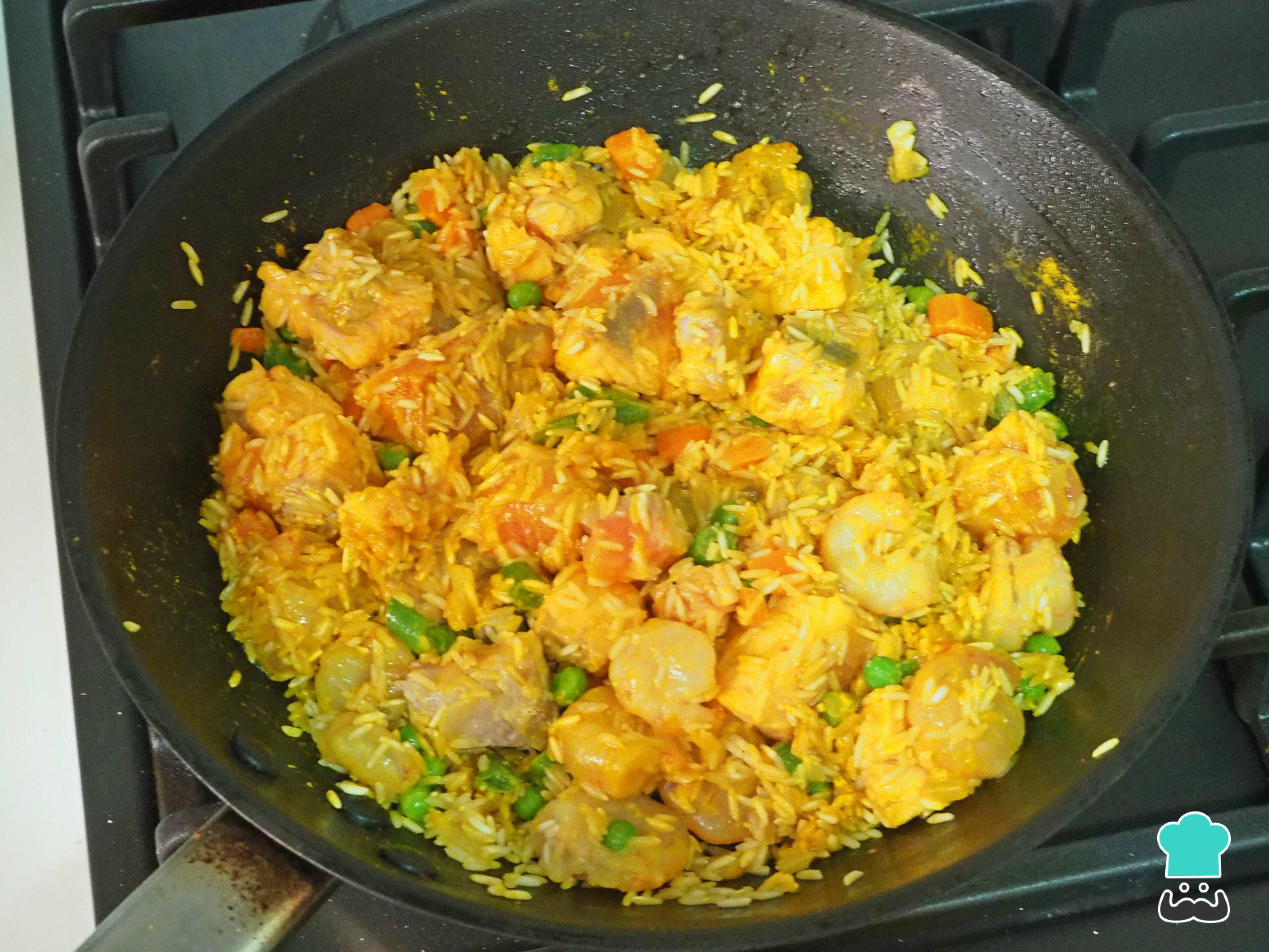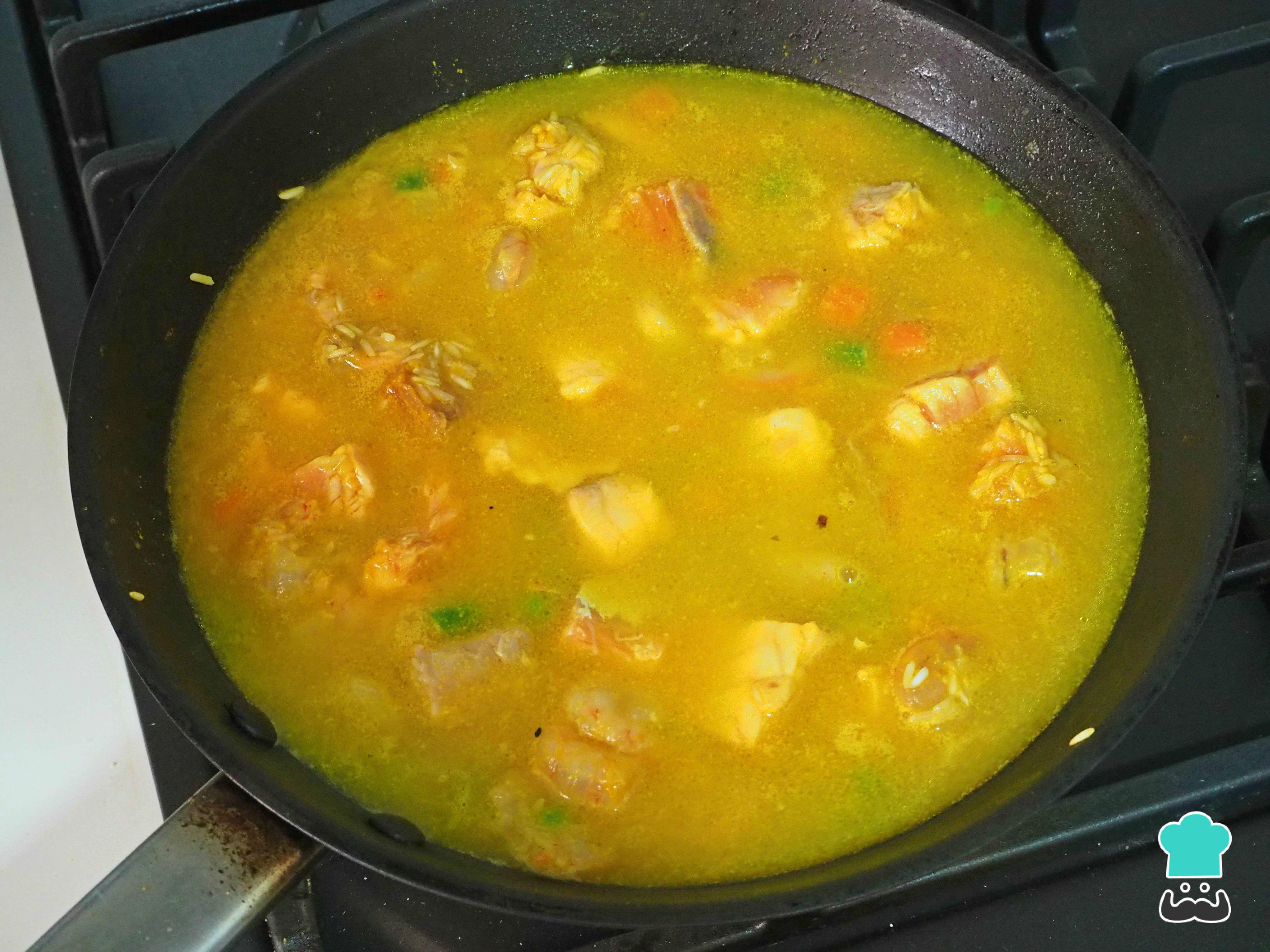 Por último, cubrimos con el caldo de pescado y subimos el fuego. Cuando llegue a ebullición, bajamos a fuego medio, tapamos y dejamos el arroz con salmón y gambas unos 12-15 minutos, según el tipo de arroz que pongáis. Lo que os ponga en la bolsa del mismo, yo, por ejemplo, usé la variedad Basmati.