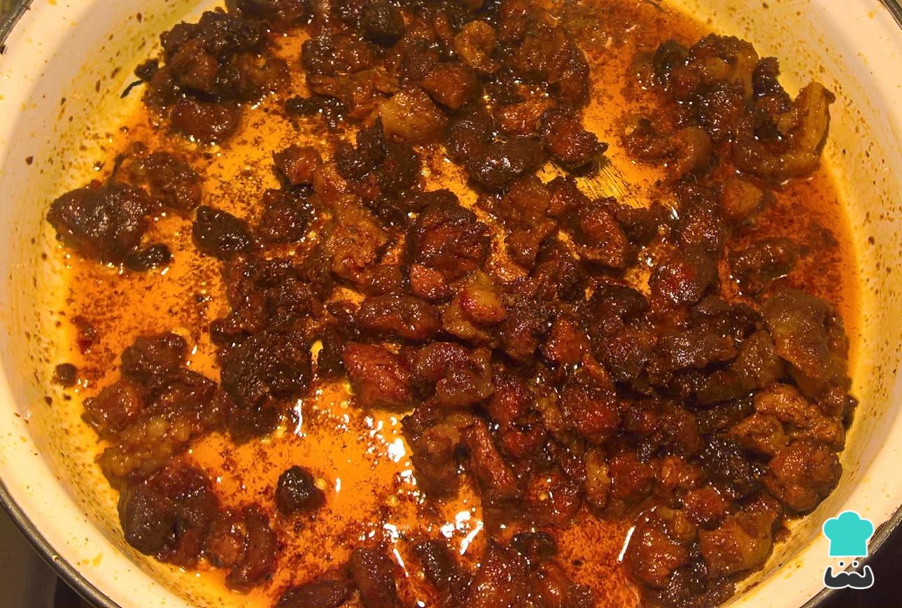Por otro lado tomamos el chorizo y lo ponemos a freír en un sartén y dejamos que se dore muy bien. Una vez listo lo retiramos del fuego y lo reservamos un momento en lo que se cuecen las papas.