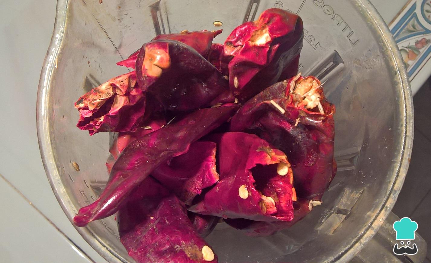 Mientras tanto en la licuadora colocamos los chiles guajillo, la cebolla, los ajo, y el refresco de cola y procedemos a licuar hasta obtener una salsa homogénea para los pambazos mexicanos.