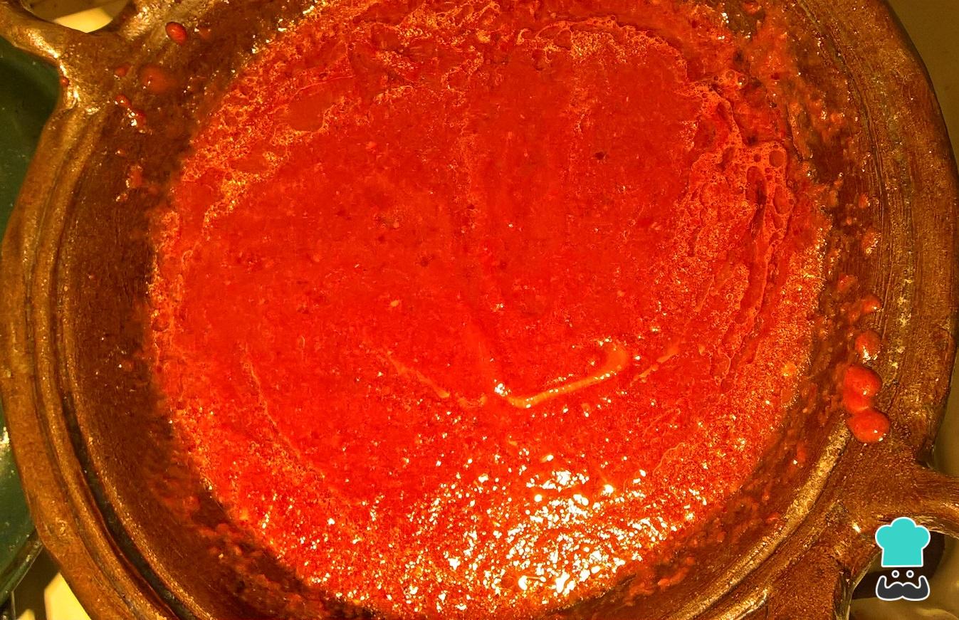 Esa salsa de chile la vamos a pasar por un colador y la vamos a colocar en una cacerola con aceite previamente calentado para que se fría por aproximadamente 6 minutos a fuego medio, añadiendo una pizca de sal. Una vez pasado este tiempo la retiramos del fuego y reservamos un momento.