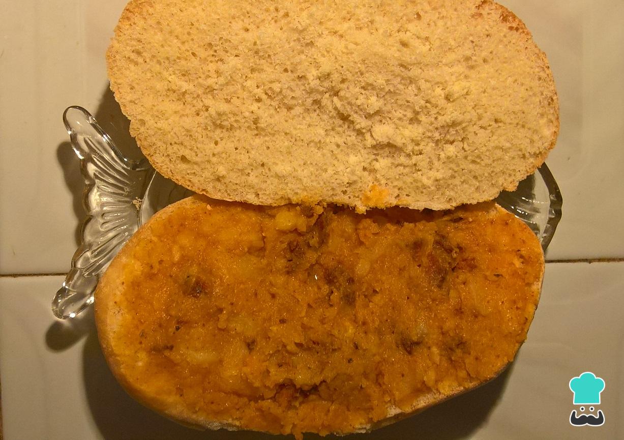 Ahora tomamos los panes para los pambazos de papa con chorizo, los partimos por la mitad en forma horizontal, y en una de las mitades untamos la mezcla de puré de papa con el chorizo frita.