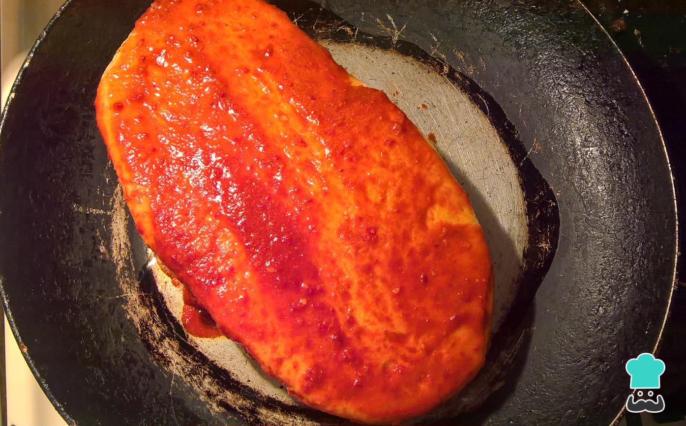 Después cubrimos completamente el pan de pambazo mexicano ya relleno con la salsa que preparamos hace un momento, y lo llevamos a freír en un sartén con aceite previamente calentado. Dejamos que se dore ligeramente de cada lado y lo retiramos del fuego.