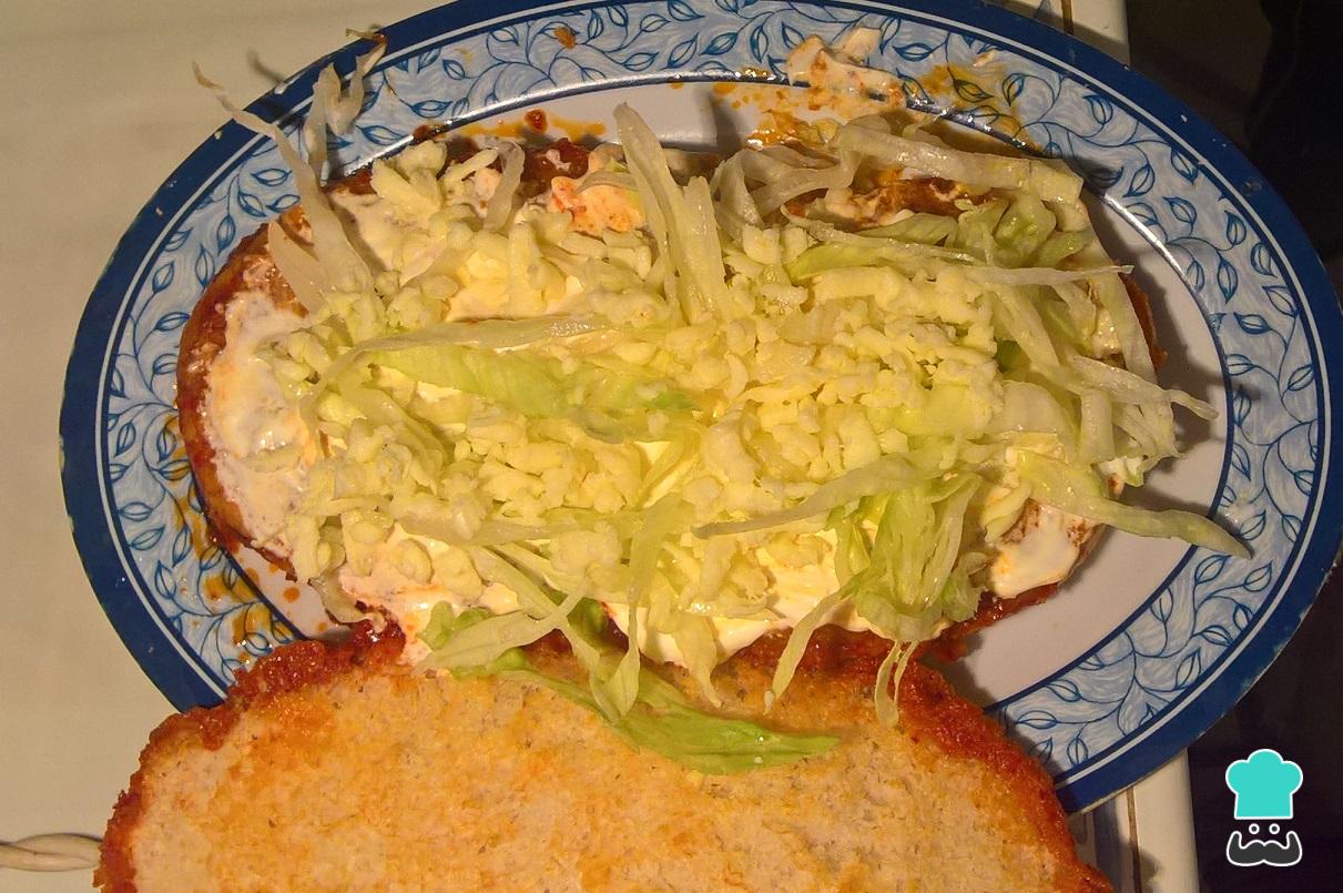 Ahora tomamos el pan cubierto de salsa y frito, lo abrimos y sobre la mezcla de puré de papa con chorizo que se encuentra sobre una de las tapas del pan untamos crema ácida, un poco de queso rallado y lechuga rebanada finamente y bien desinfectada.