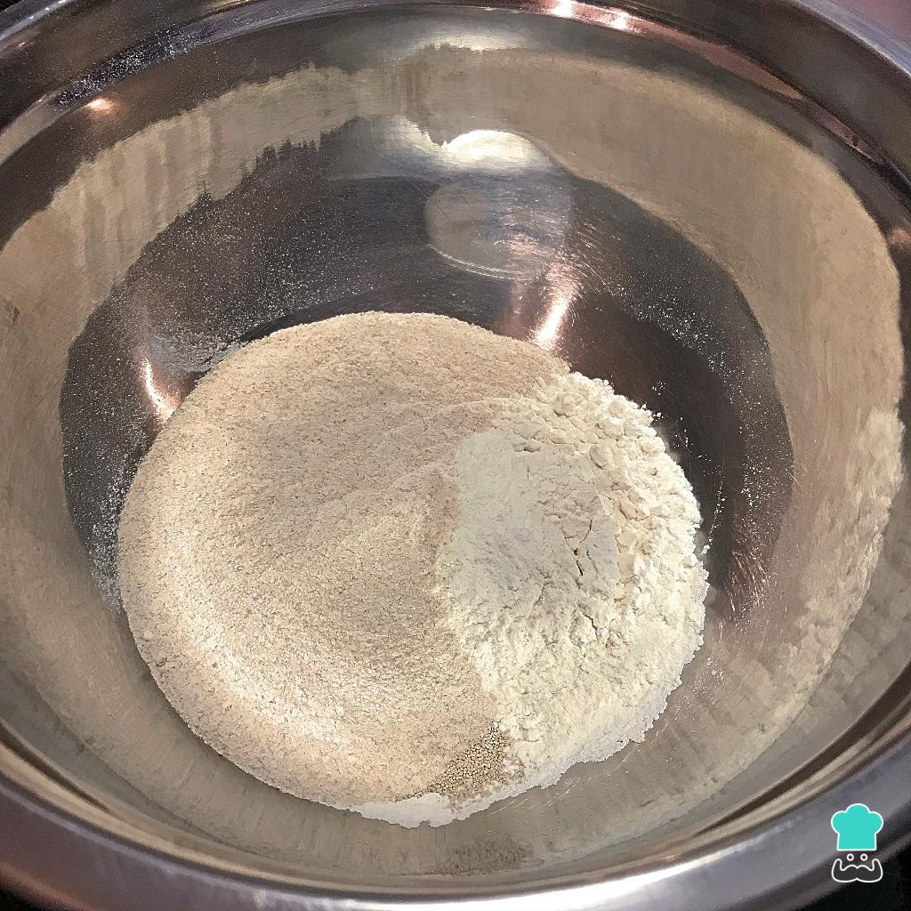 En un bol, mezcla las dos harinas con la levadura y la sal. Si lo prefieres, puedes utilizar un tipo de harina uniendo ambas cantidades puesto que el pan casero sin masa madre quedará igual de delicioso.