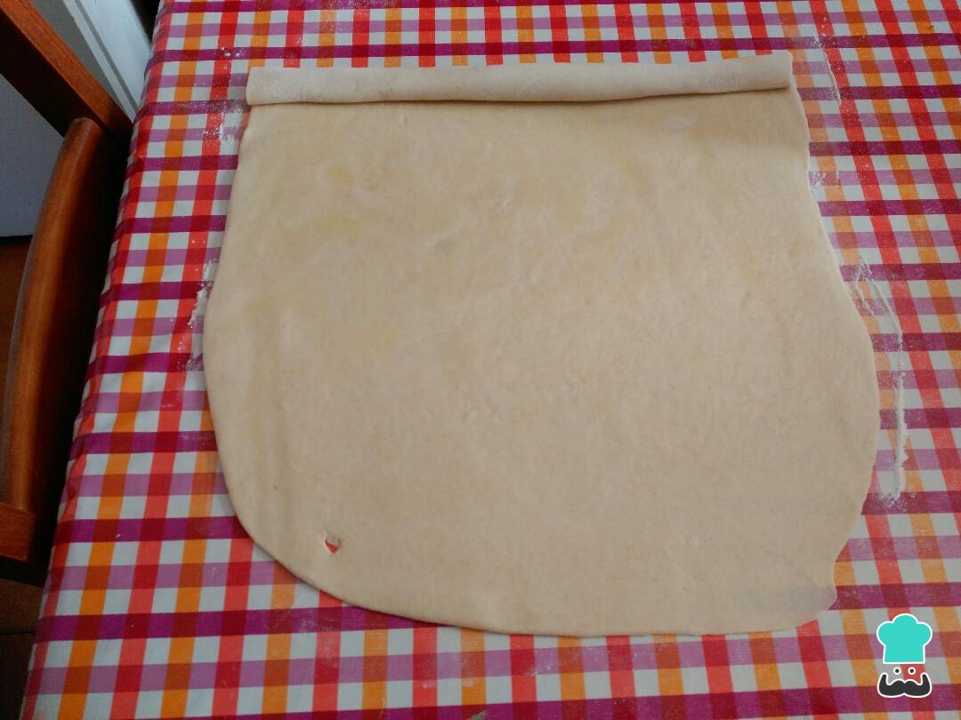 Estira ahora la masa, haciendo un rectángulo, y dale un grosor aproximado de 40 mm. Echa un chorrito de aceite sobre la masa del pan chino dulce con Thermomix y extiéndelo de arriba hacia abajo con la palma de la mano, dejando sin aceitar un centímetro en la parte de abajo, entonces vuelve a la parte de arriba de la masa y empieza a enrollarla hacia adentro dejando el cierre hacia abajo.