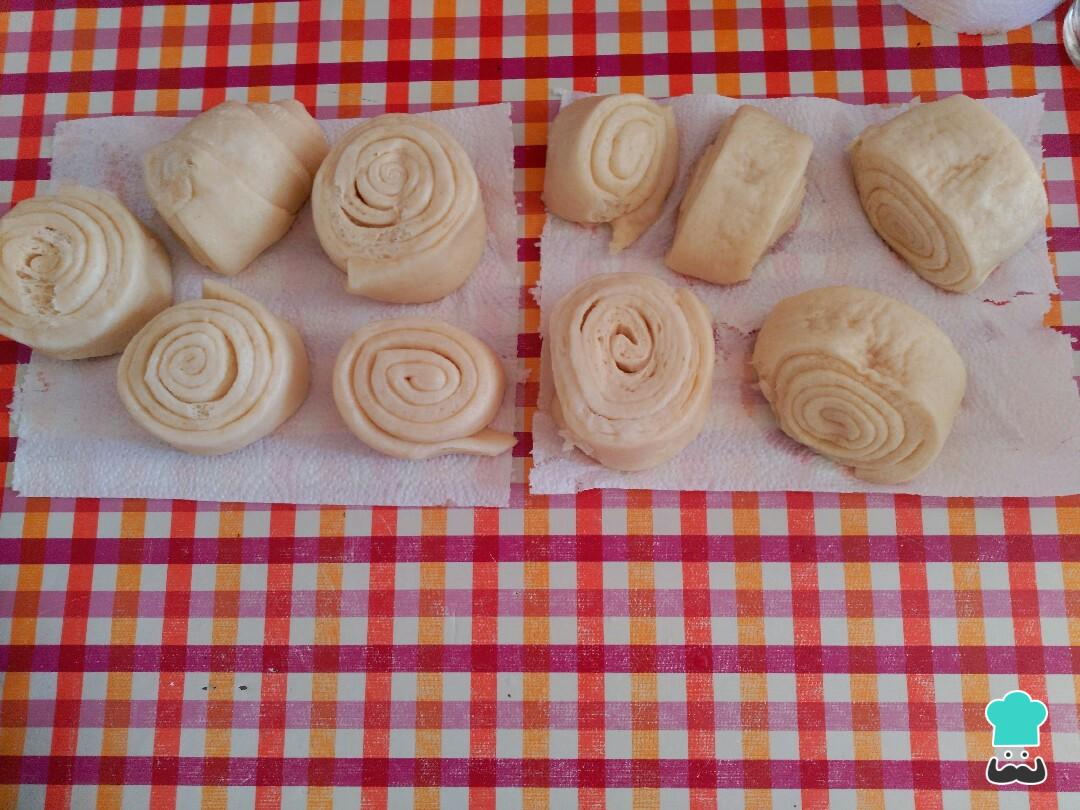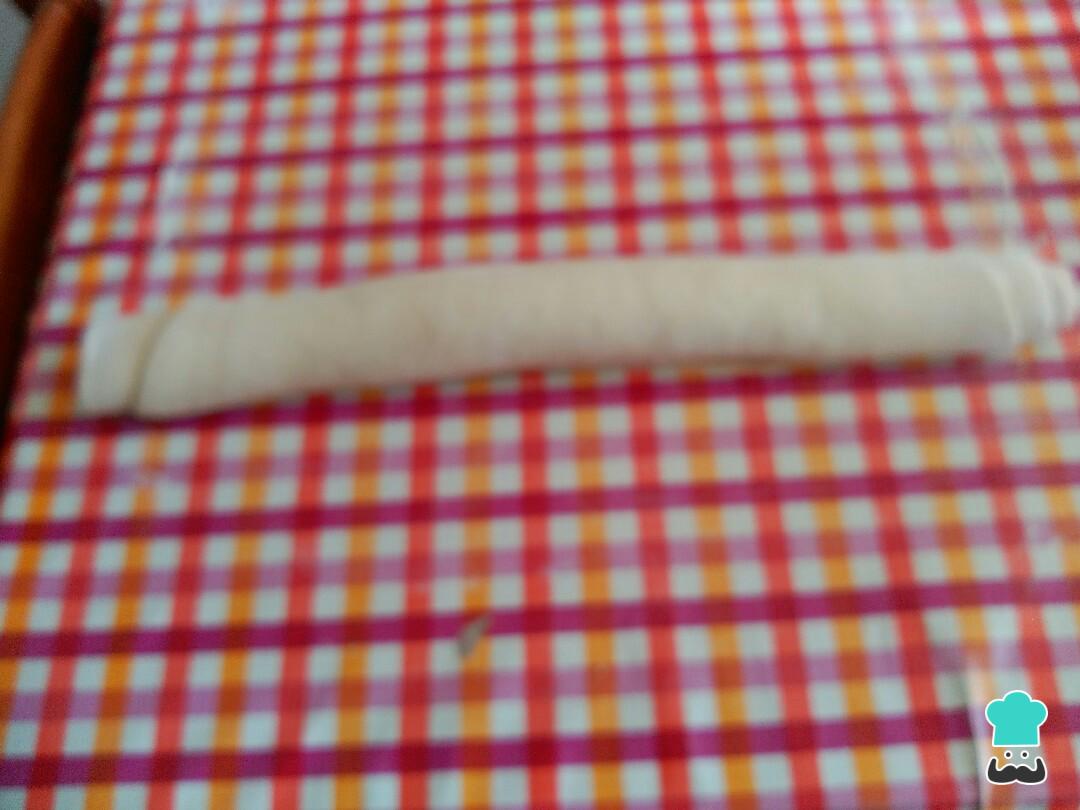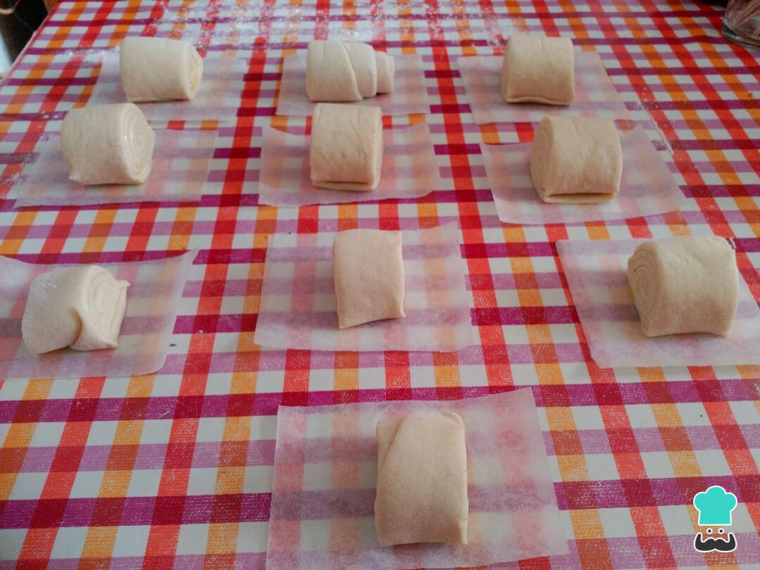 Te quedará un rollo de masa como en la fotografía. Divídela con un cuchillo haciendo 8 o 10 partes iguales, y pon cada una de las porciones sobre un trozo de papel de hornear.