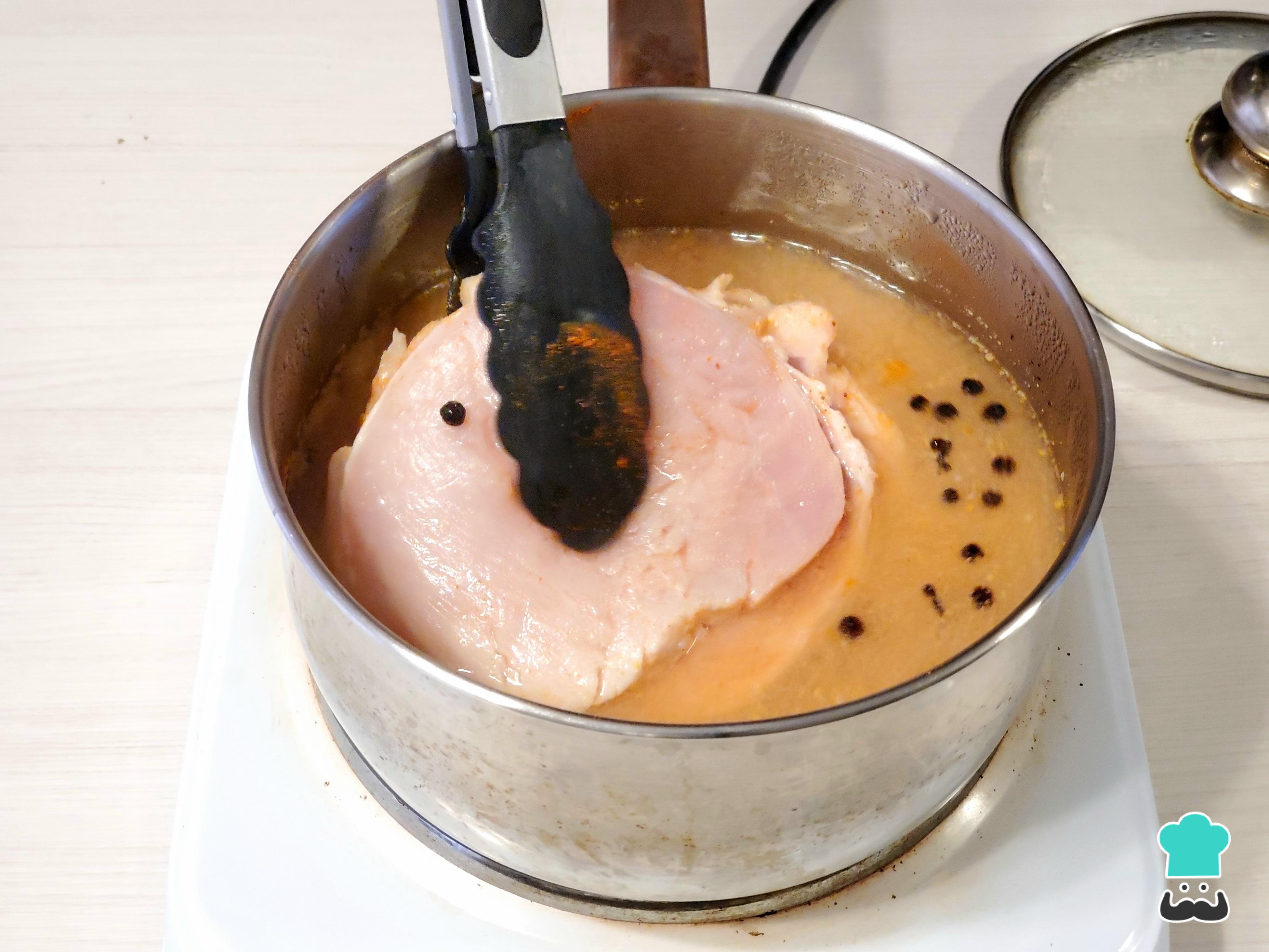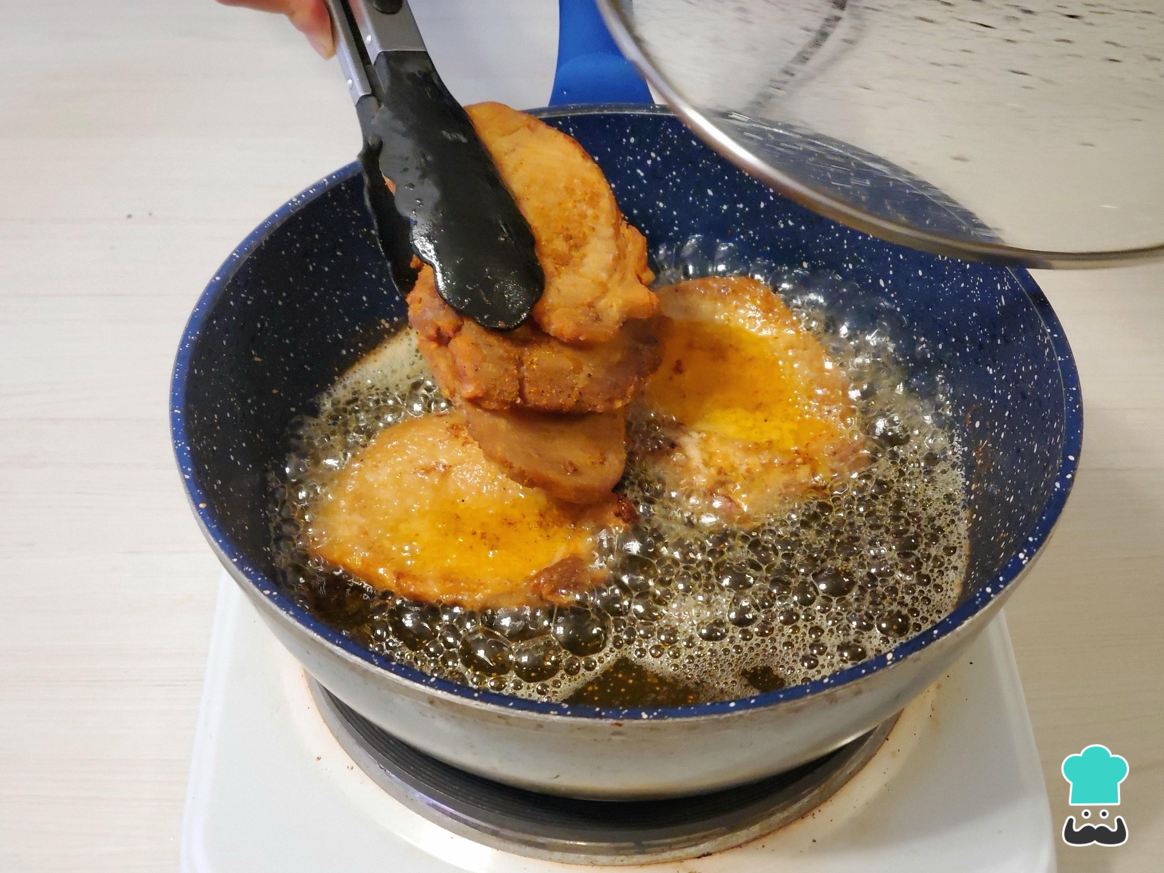 Cuando el agua se haya resumido por completo, la panceta debe haber soltado su grasa, así que continúa dorándola en esta manteca. La manteca debe estar muy caliente y debe cubrir toda la pieza de cerdo, si no hay suficiente grasa le puedes agregar más aceite. No pases más de 5 minutos dorando la panceta porque puede terminar con una corteza muy dura. Cuando la panceta obtenga un color dorado uniforme, retírala de la sartén y córtala en rodajas gruesas. Reserva.