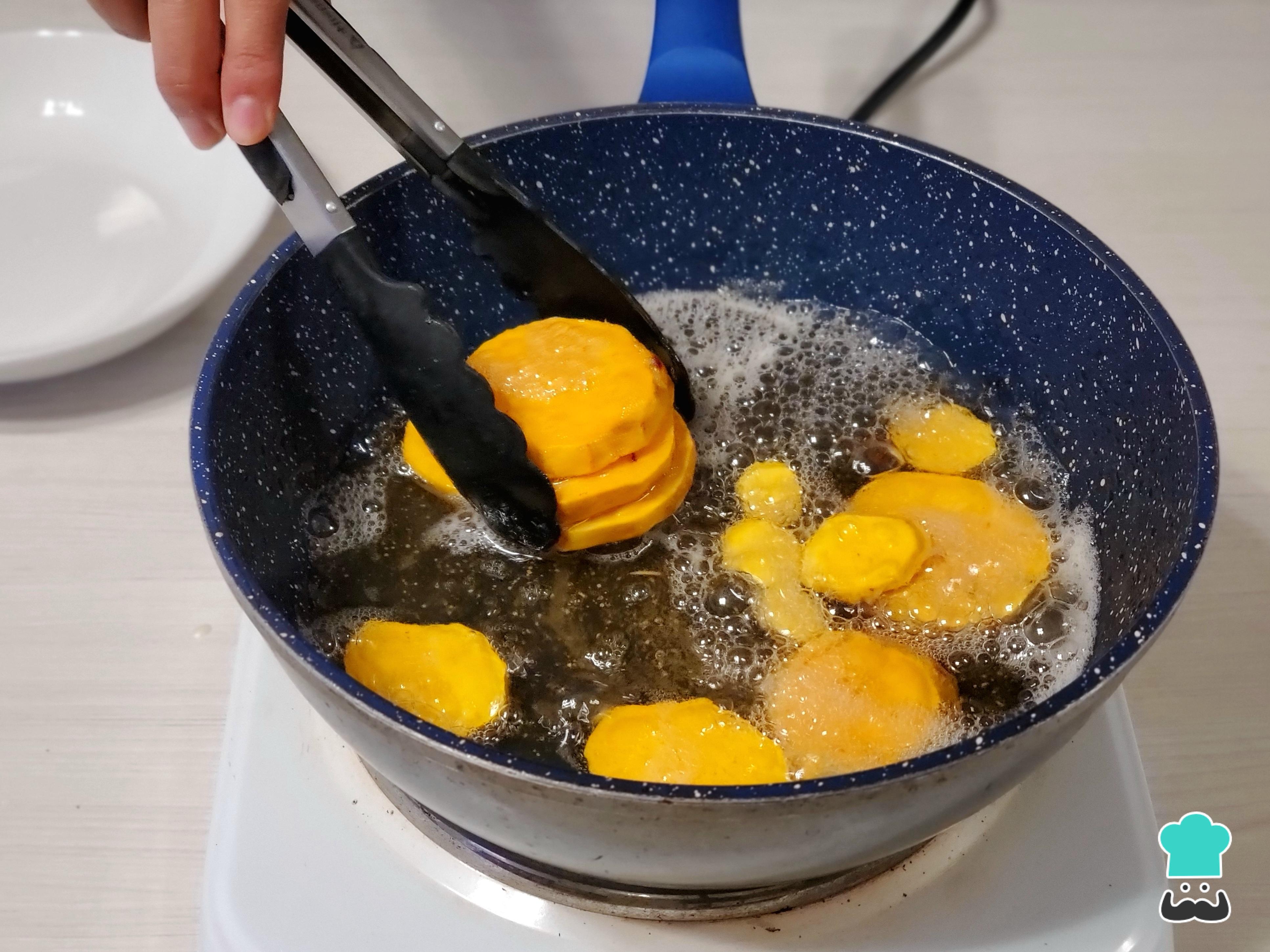 Aparte, pela y corta los camotes en rodajas de 1/2 cm de grosor aproximadamente; fríelos inmediatamente en la manteca de cerdo por un par de minutos hasta que estén dorados. Retira los camotes de la grasa y déjalas escurrir sobre hojas de papel toalla. Reserva.