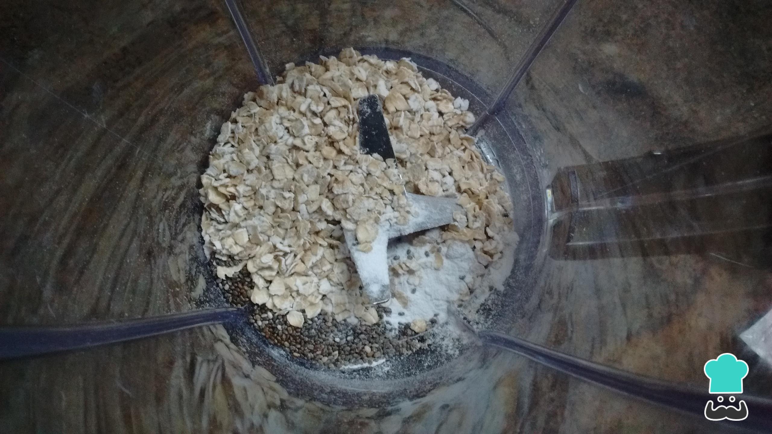 Para empezar con la preparación del pan de avena en microondas sin huevo, procesa en una licuadora o procesadora, los copos de avena, la cucharadita de chía y la pizca de sal. Si tienes harina de avena, puedes continuar con el siguiente paso.