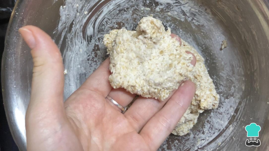 Añade lentamente el agua a temperatura ambiente hasta obtener una consistencia maleable como ves en la imagen. Puedes reposar la preparación unos 2 o 3 minutos para que la avena se termine de hidratar o, si estás apurado, continuar con el siguiente paso.