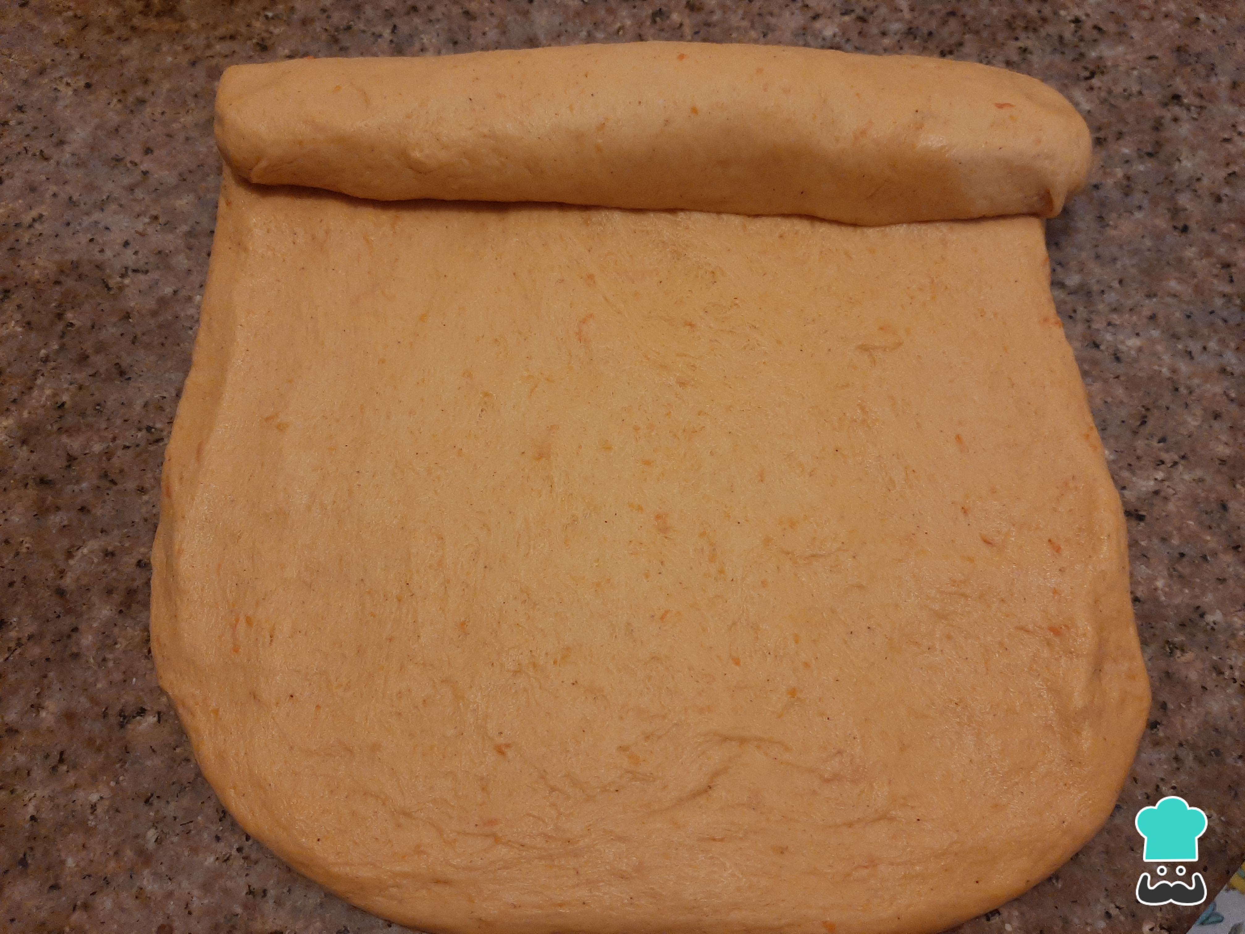 Estira la masa en una superficie plana. Para estirar la masa utiliza las manos, aplástala ligeramente para eliminar el exceso de aire y enrolla la masa de arriba hacia abajo.