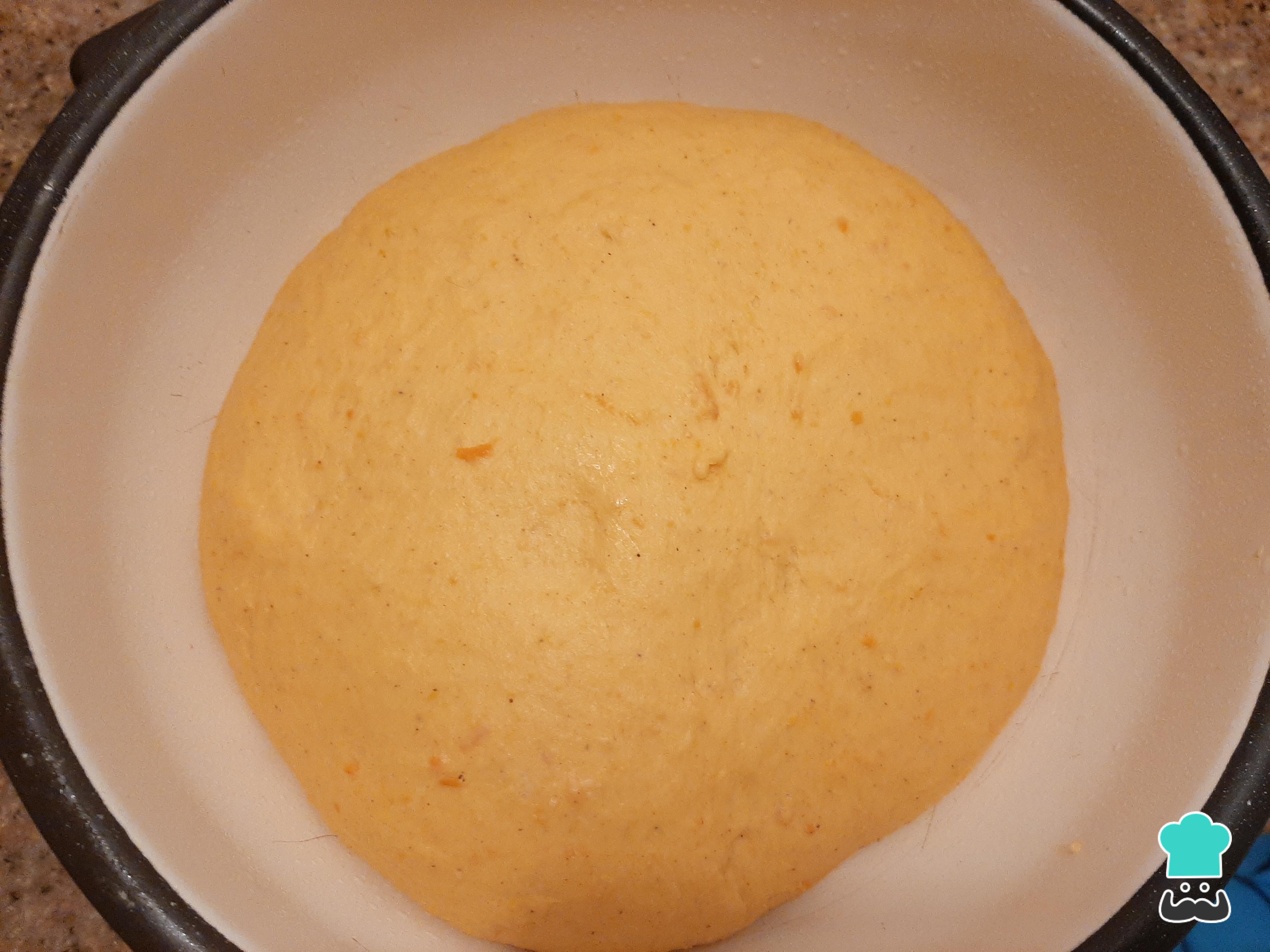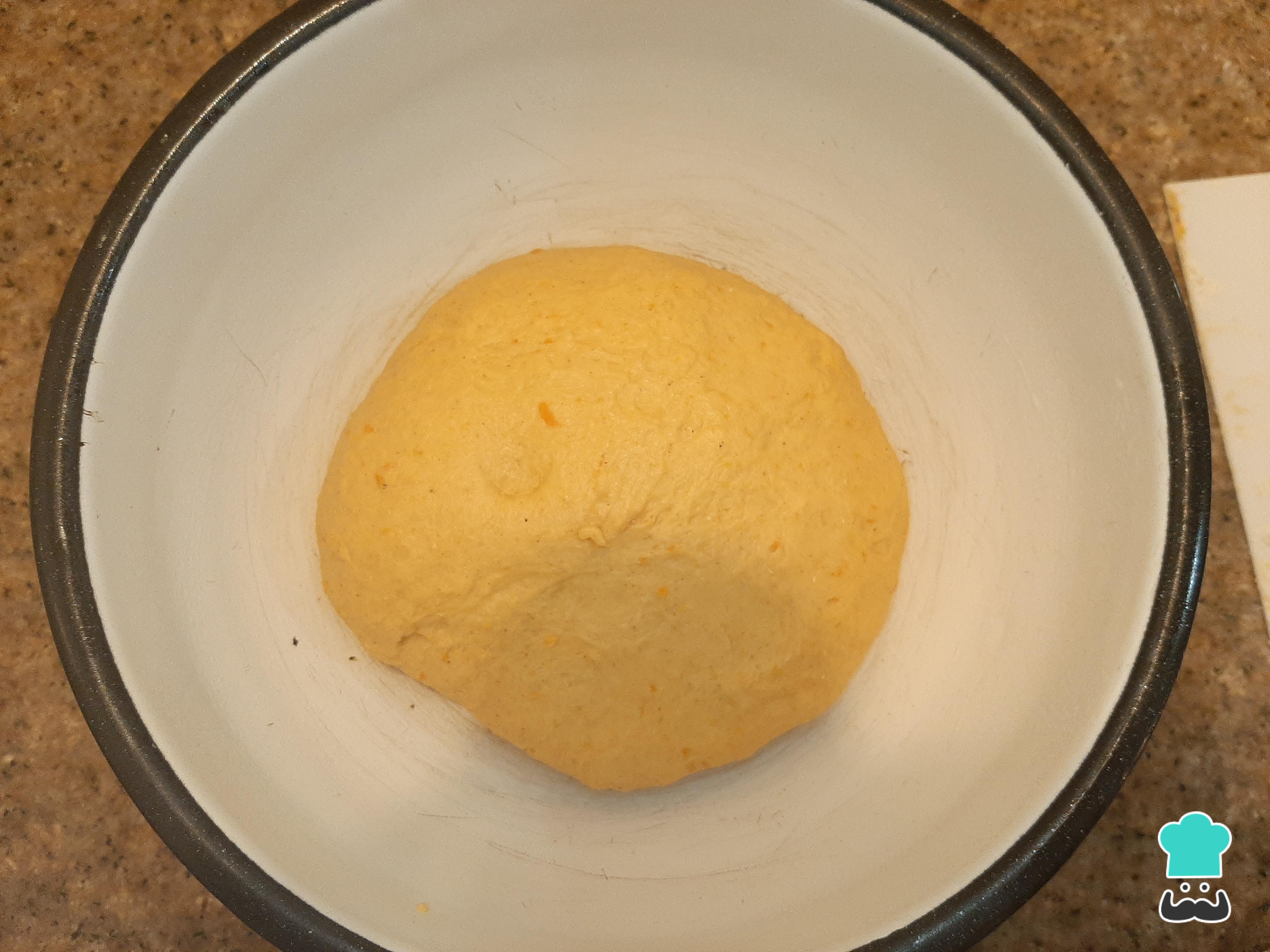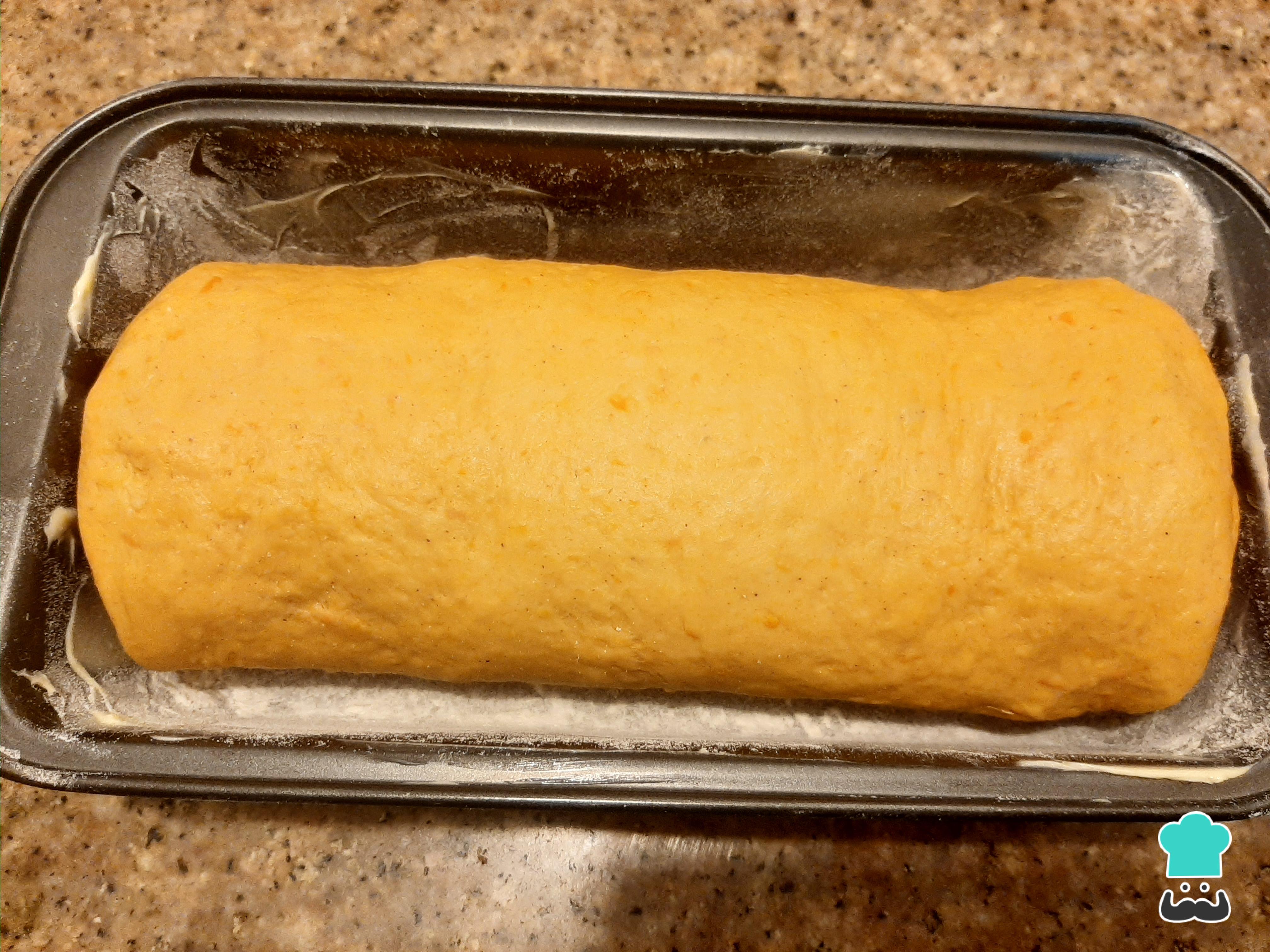 Coloca la masa en un recipiente, sobre todo no olvides que el doblez va hacia abajo. Tapa y deja reposar entre 30 y 50 minutos. ¡Ya casi está listo el pan de boniato!