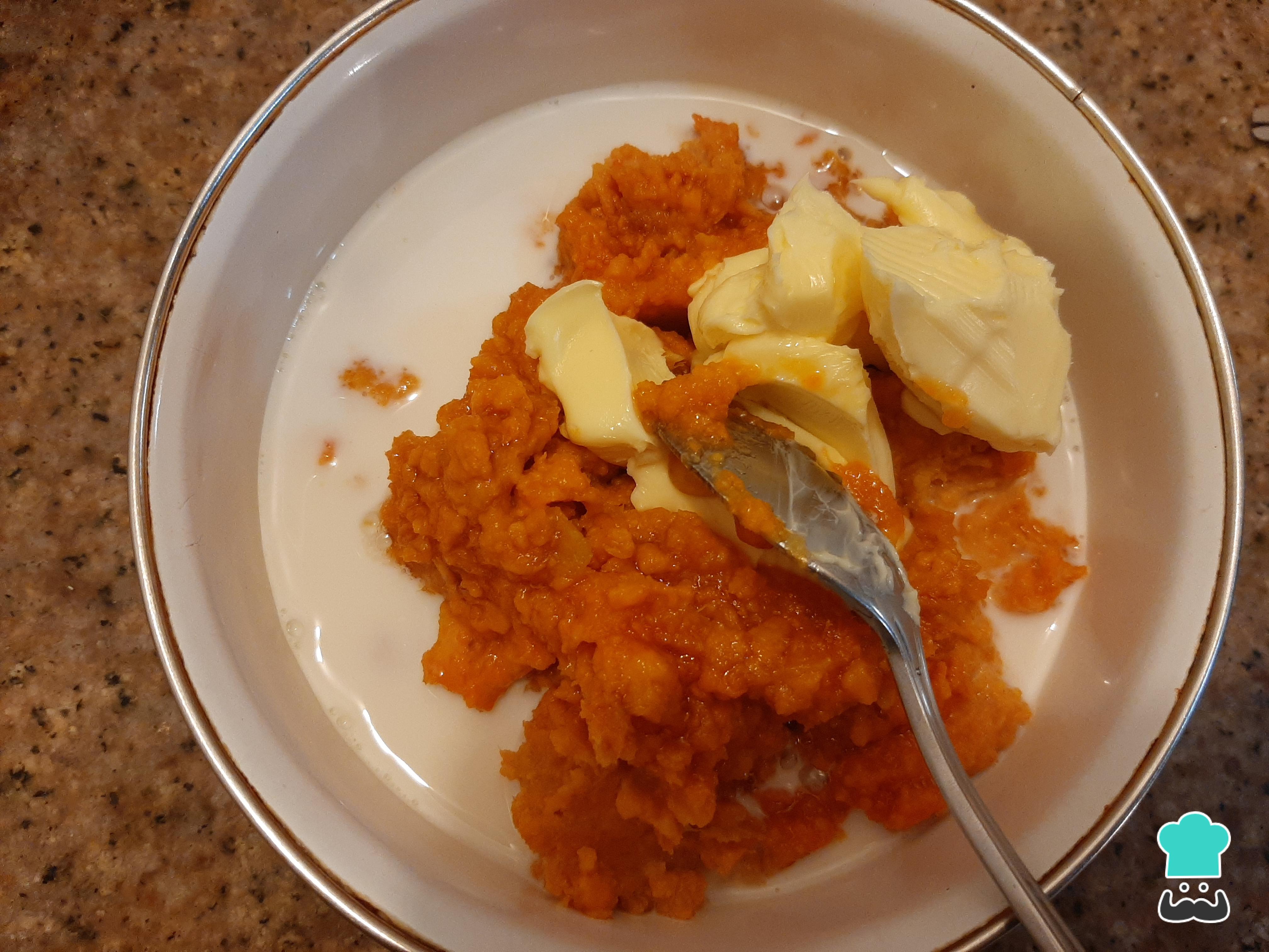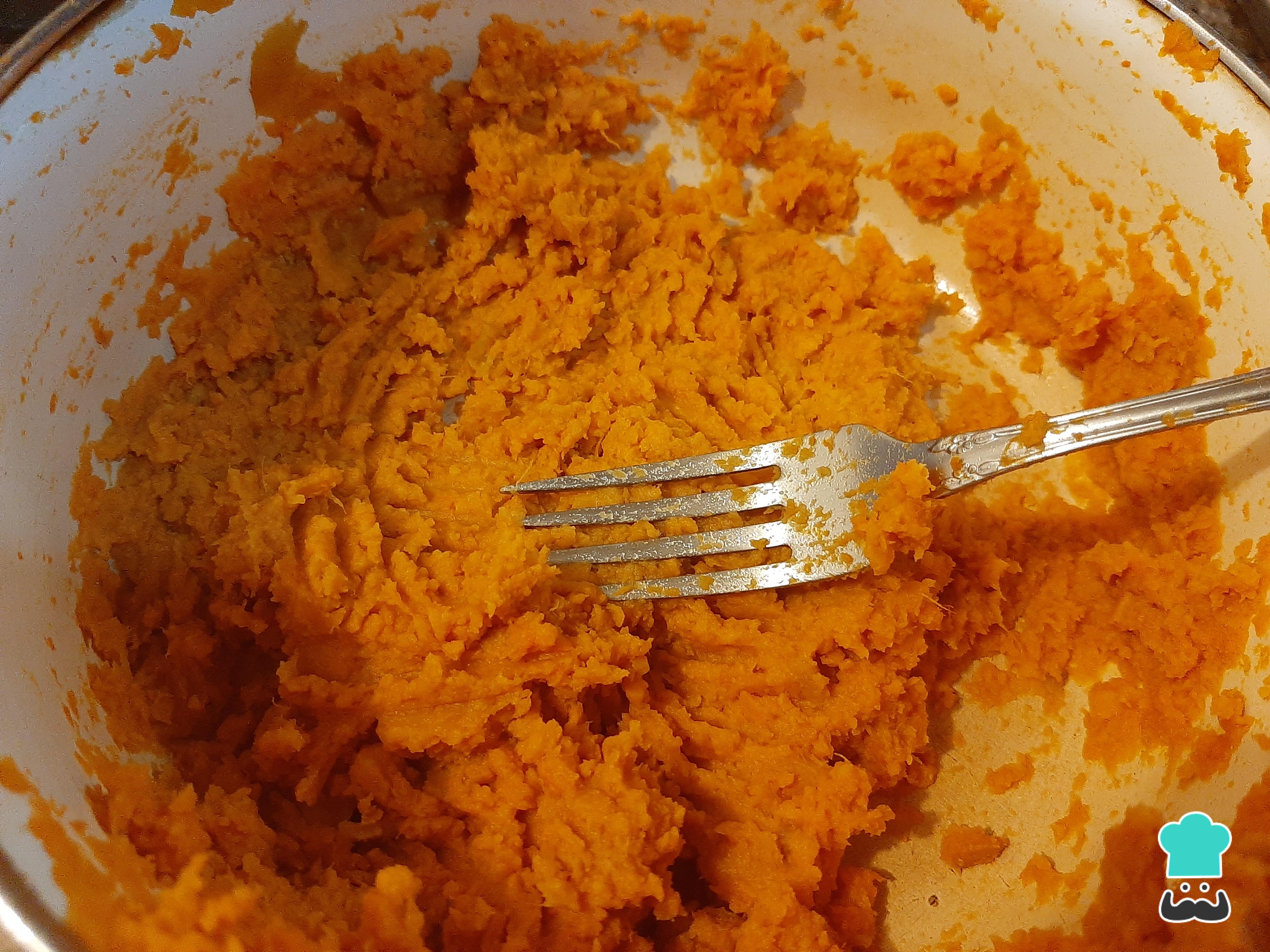 Retira la piel de los boniatos y aplasta la pulpa utilizando un tenedor. Reserva el boniato triturado en un bol.