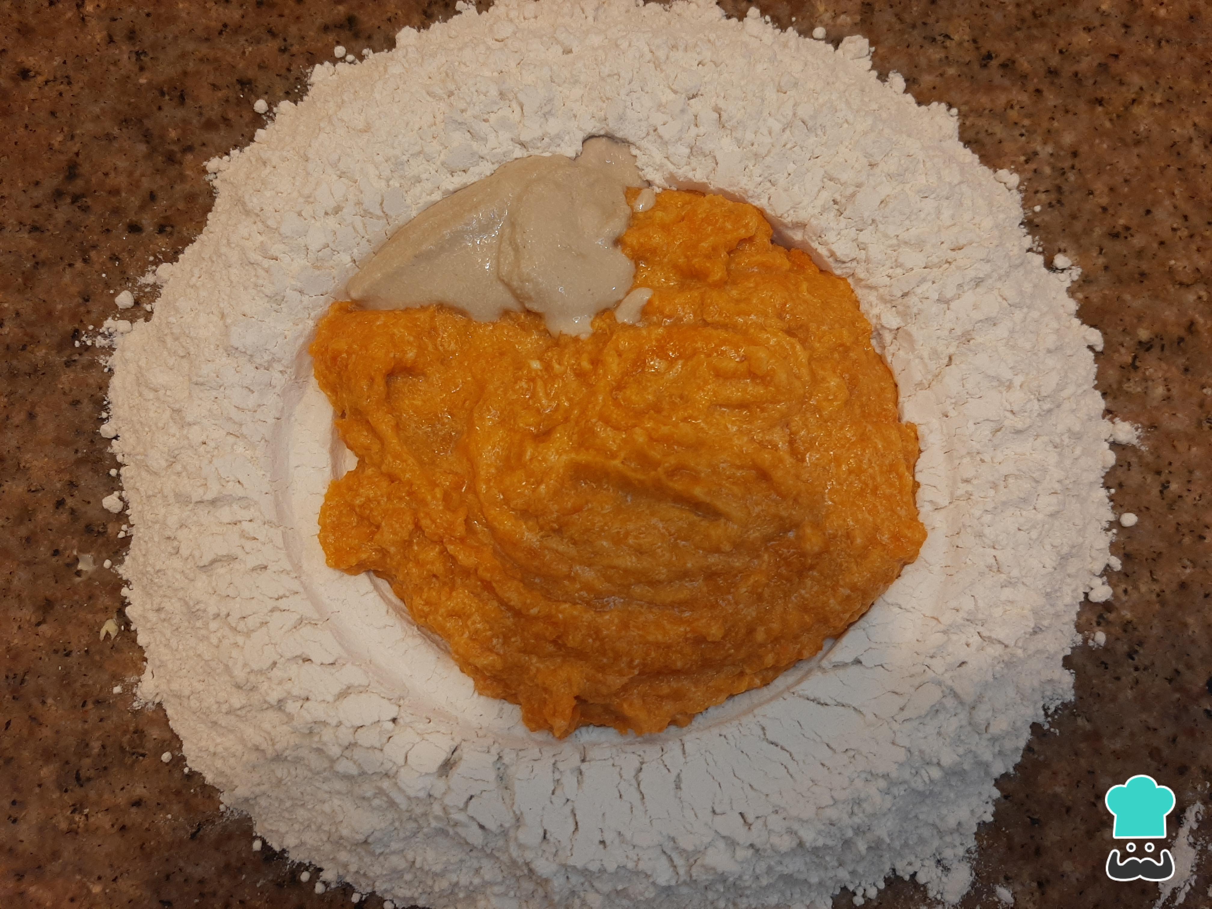 Forma una fontana de harina con ayuda de un bol y coloca la mezcla de boniato y levadura en el centro de la fontana.