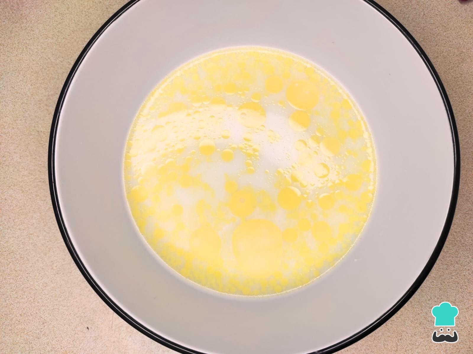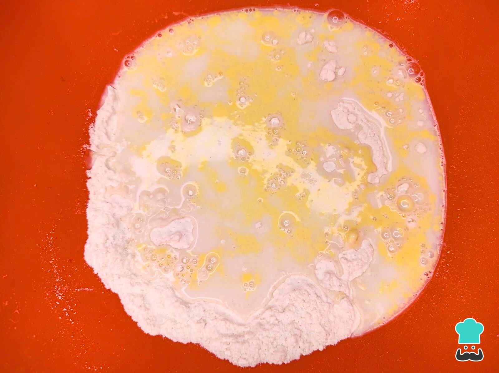 Añade al bowl la mezcla de leche, agua y mantequilla, además del huevo batido.