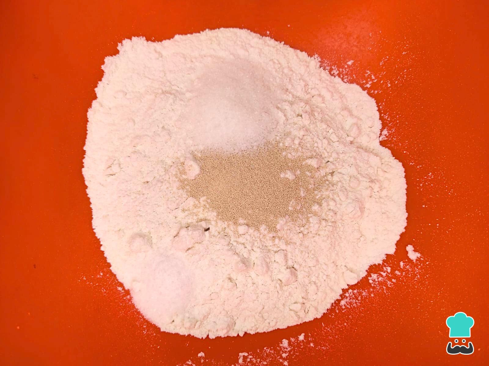 En un bowl coloca la harina, la levadura, el azúcar, la sal y mezcla.