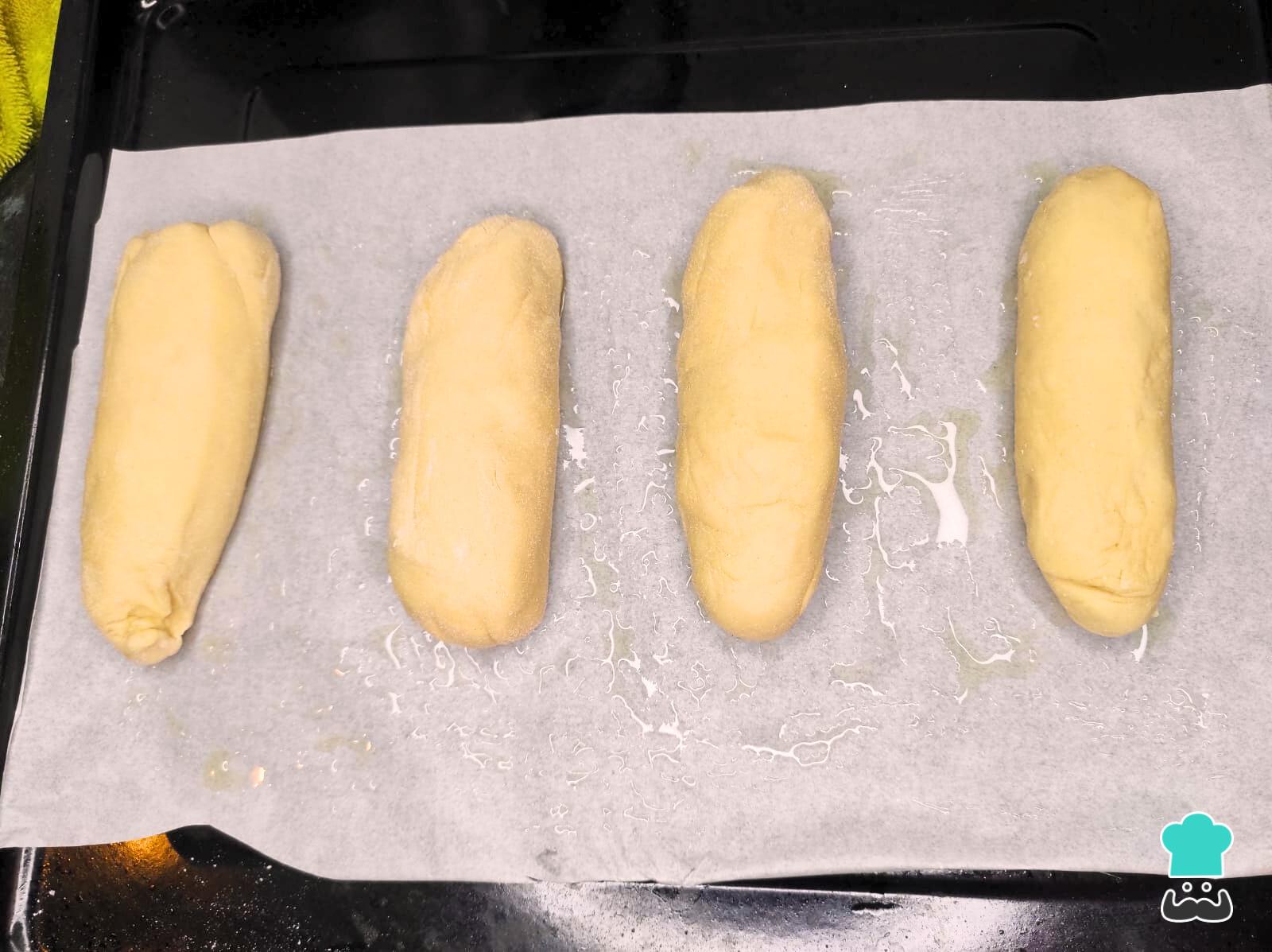 Divide la masa en 8 porciones iguales y forma cilindros de 15 centímetros. Posiciona en una lata aceitada, dejando espacio entre cada masa.