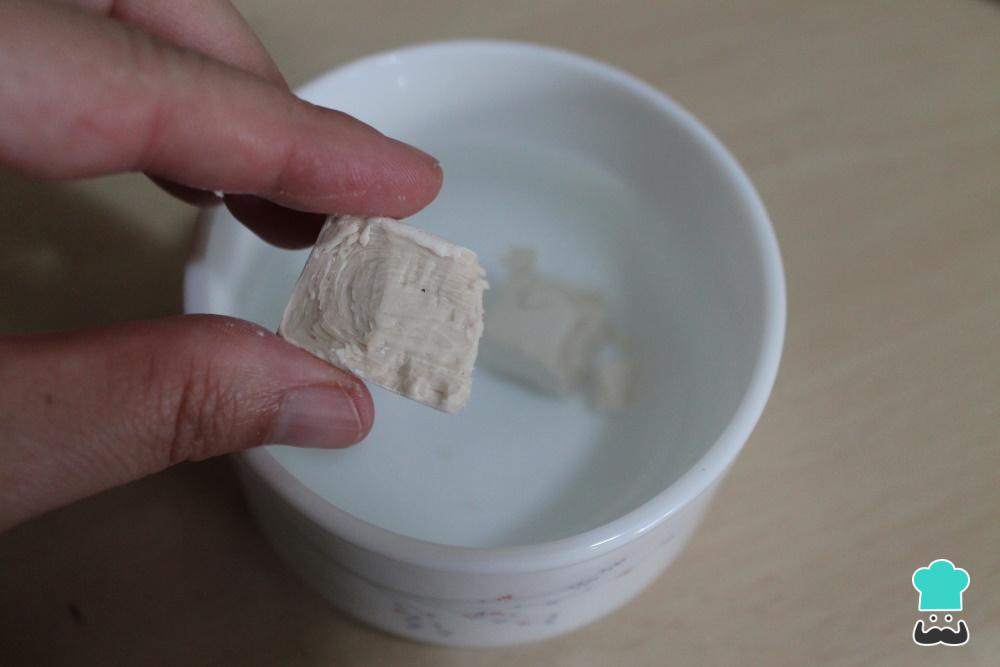 Diluye la levadura en aproximadamente la mitad del agua templada.