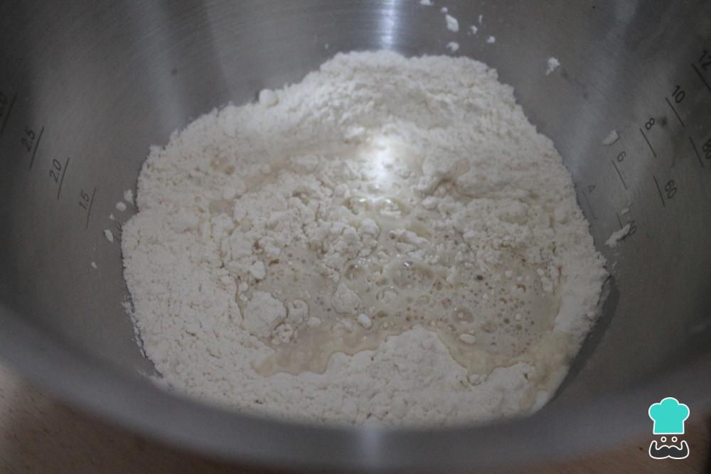Pon en un bol los 200 g de harina de fuerza y el agua donde has diluido la levadura. Mezcla bien y cubre con un paño. Deja reposar la masa durante 20 minutos.