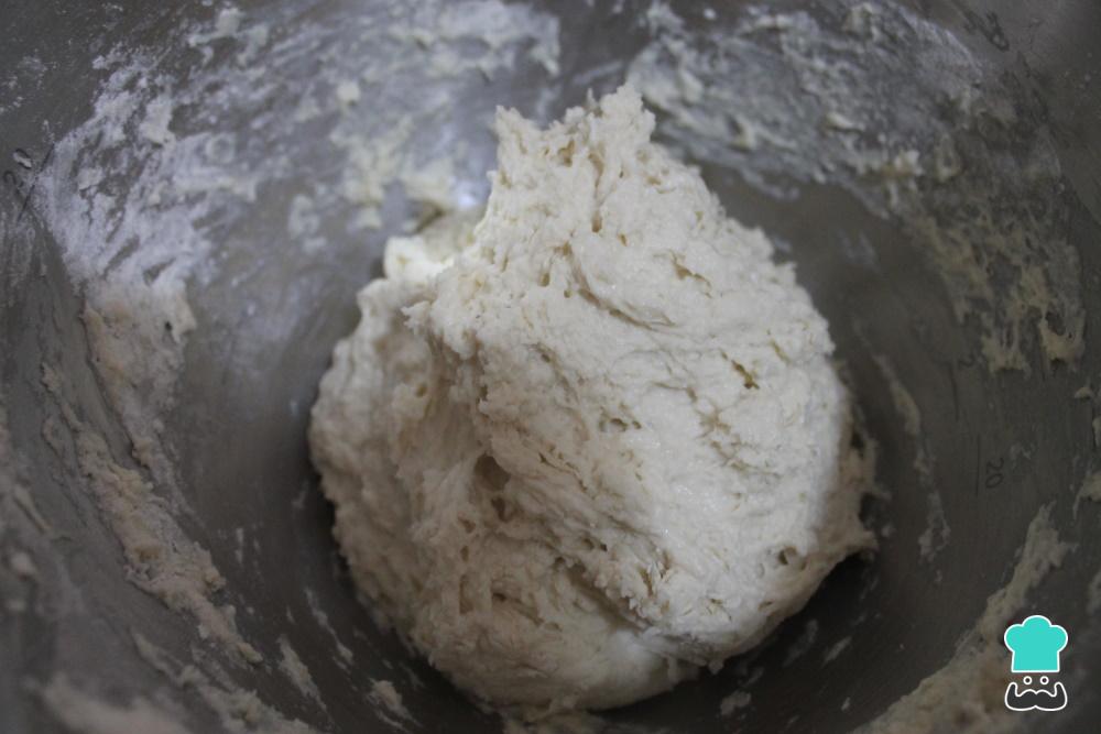 Pasados los 20 minutos, incorpora la harina restante y la sal. Ve añadiendo también el resto de agua tibia poco a poco. No añadas toda el agua porque quizás no la necesites, dependerá de la humedad que necesite tu harina. Nosotros hemos utilizado los 250 ml. Amasa unos 10 minutos, teniendo en cuenta que la masa del pan de hogaza tiene que quedar un poco pegajosa en este punto. Si la amasas con un robot de cocina, utiliza el gancho de amasar. La masa tendrá que despegarse de las paredes, pero tiene que quedar adherida un poco en el fondo del bol. Cubre con un trapo y deja que repose en un lugar cálido durante una hora y media.
