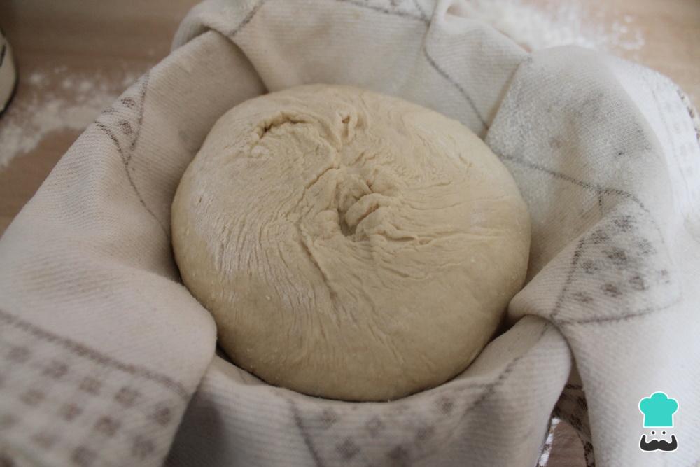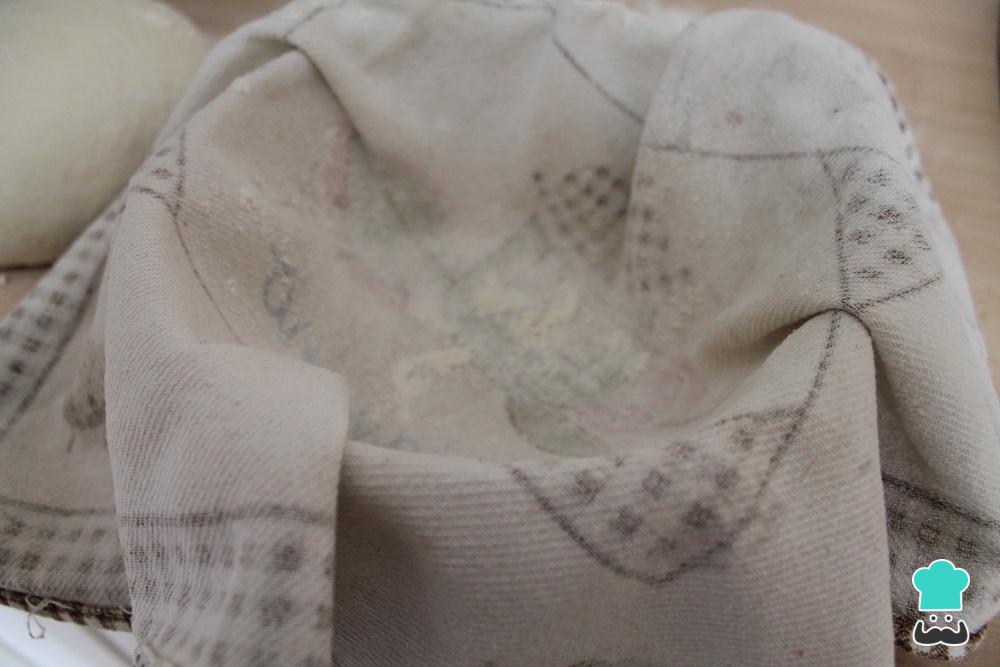 Coge un bol redondo algo más grande que la masa de pan, pon un paño de cocina de algodón encima y enharina.