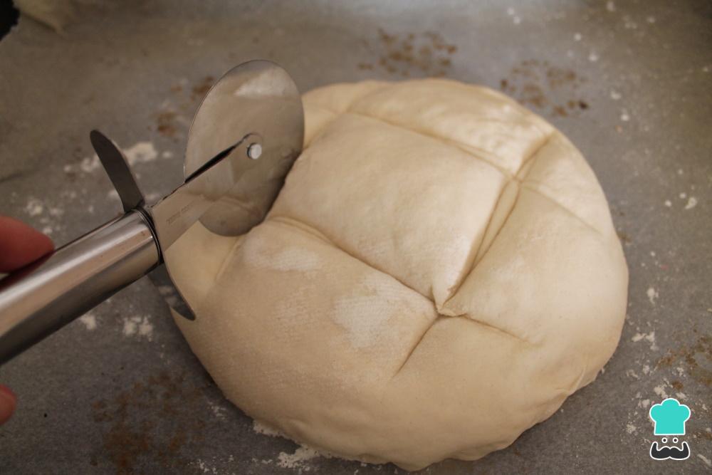 Cuando haya pasado el tiempo de reposo, forra una bandeja con papel de horno. Precalienta a su vez el horno a 200 ºC y pon una bandeja de agua en el interior para crear vapor. Coge el paño de cocina donde se encuentra la hogaza de pan y ponla en la bandeja que tienes forrada de papel de horno, dándole la vuelta al pan de forma enérgica para que no pierda forma. Esta vez tiene que quedar la parte lisa arriba y la de los pliegue abajo. Con un cuchillo afilado, haz cuatro cortes en la parte superior de la hogaza de pan.