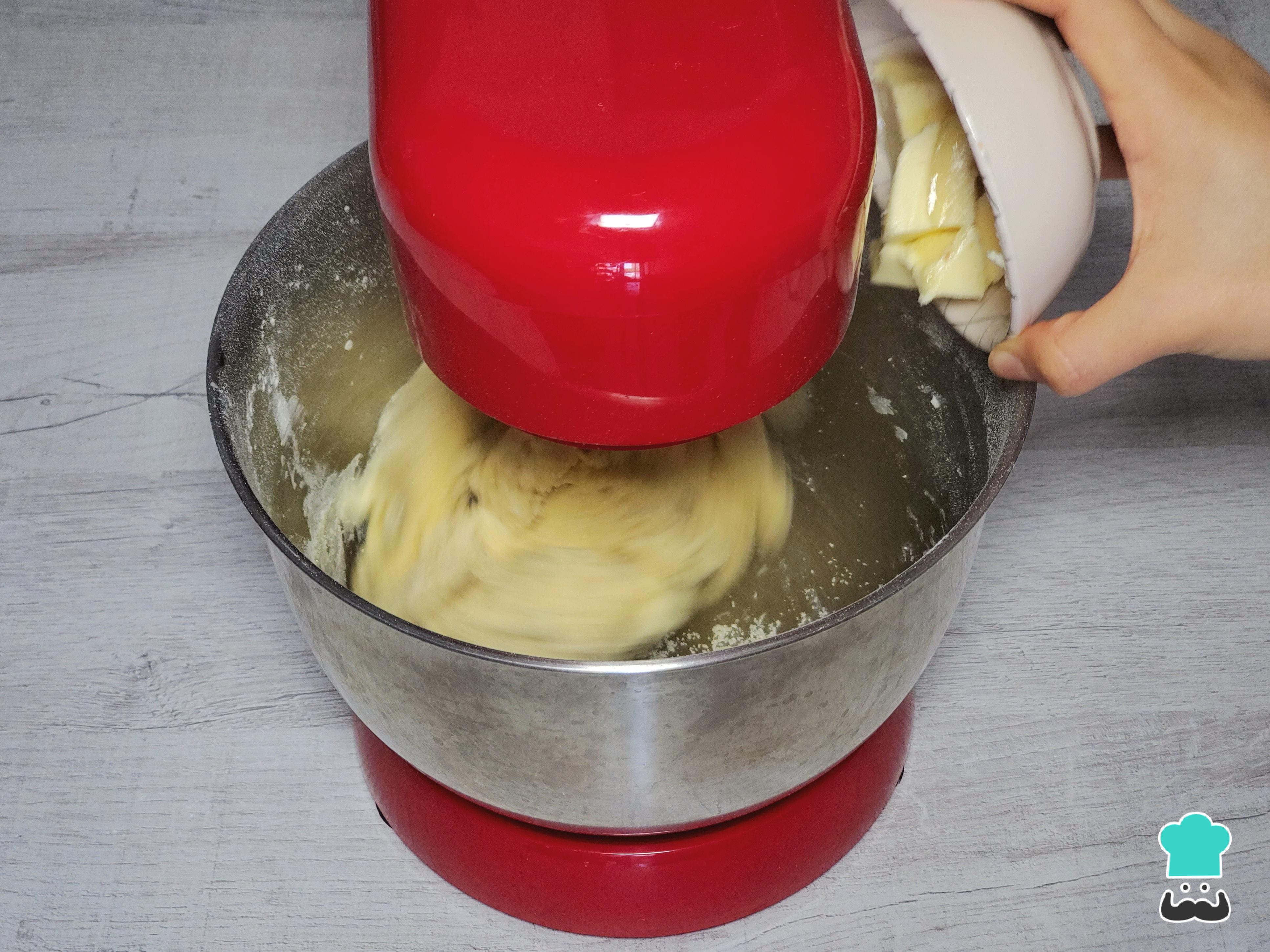 Cuando los ingredientes comiencen a integrarse, incorpora poco a poco la mantequilla cortada en cubos. Amasa durante aproximadamente 10 minutos, o hasta que el gluten se haya desarrollado.
