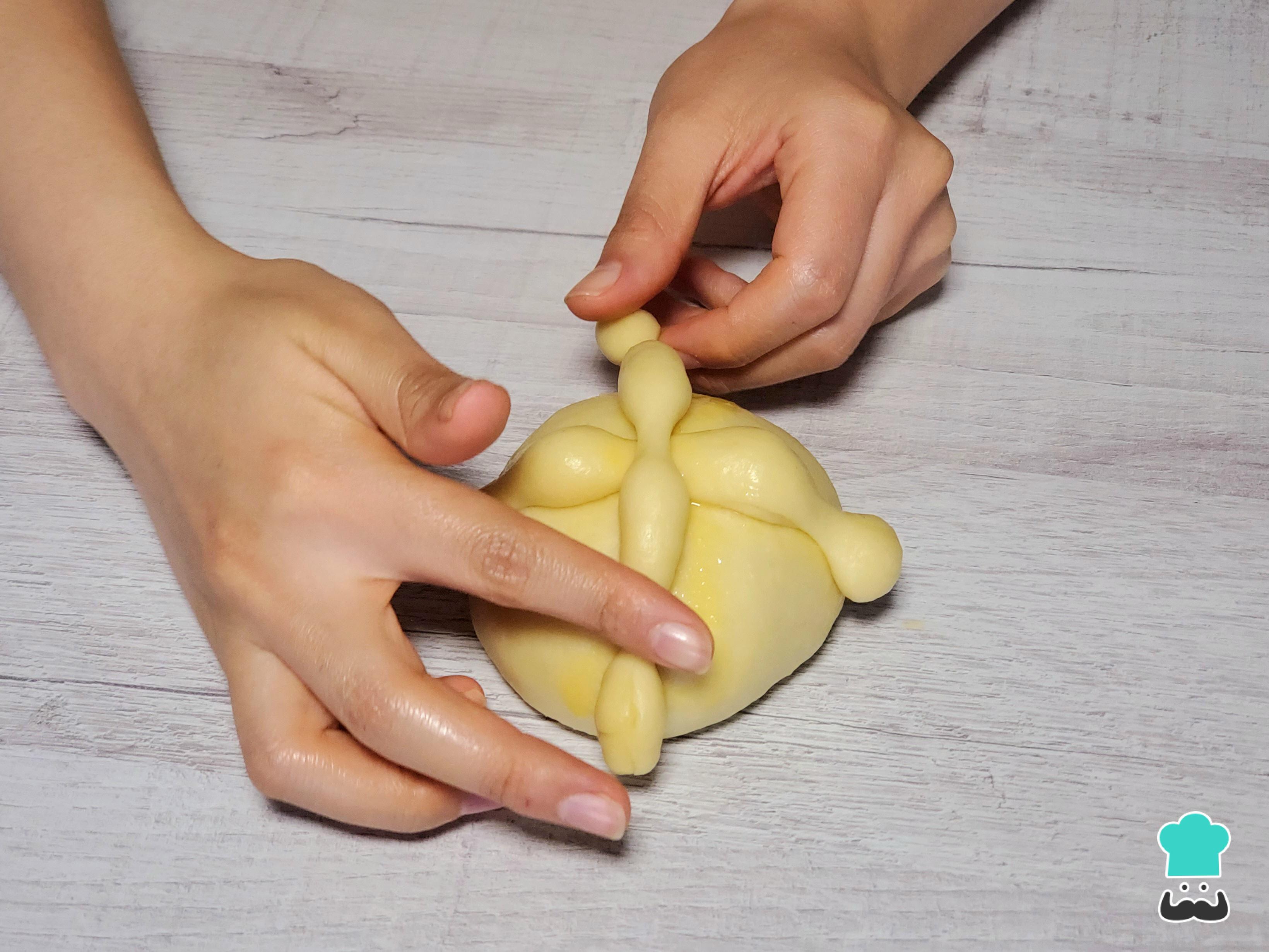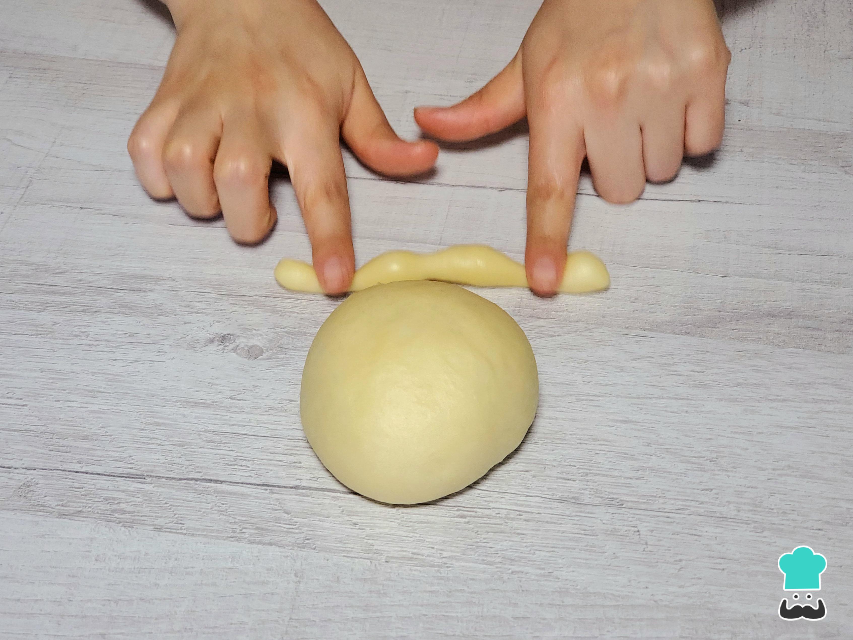 Una vez leudada, retira la masa del bowl y colócala sobre una mesa limpia para desgasificarla. Es decir, aplástala suavemente hasta que libere el aire. Luego, divídela en porciones. Esta receta rinde para cuatro panes grandes, así que pésala y divídela en cuatro partes. De cada una, retira 2 o 3 porciones de aproximadamente 10 gramos y 4 bolitas pequeñas de unos 3 gramos para realizar las decoraciones.