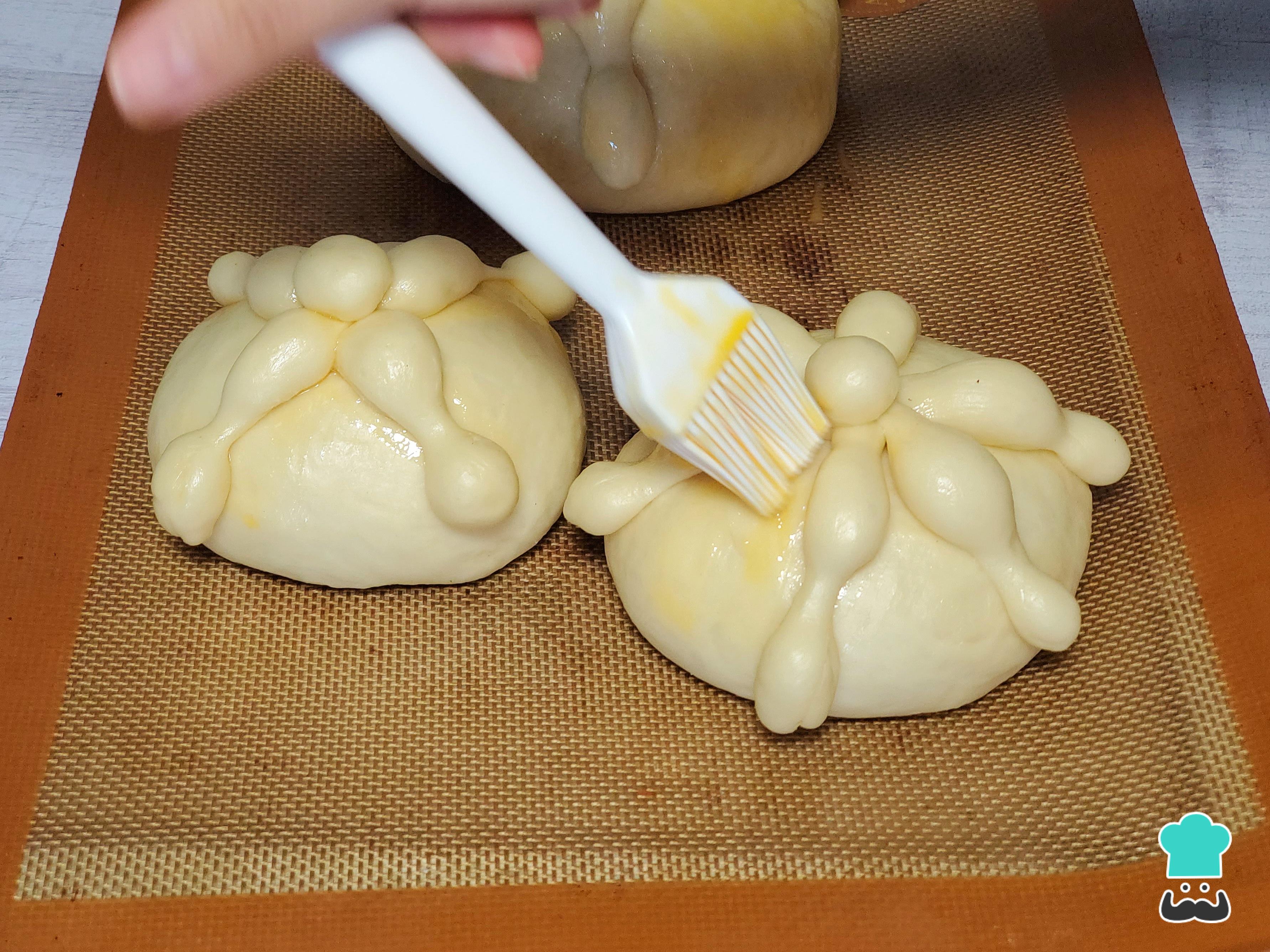 Barniza la superficie de los panes con huevo batido y hornea a 165 °C durante unos 20 minutos, o hasta que estén bien dorados.