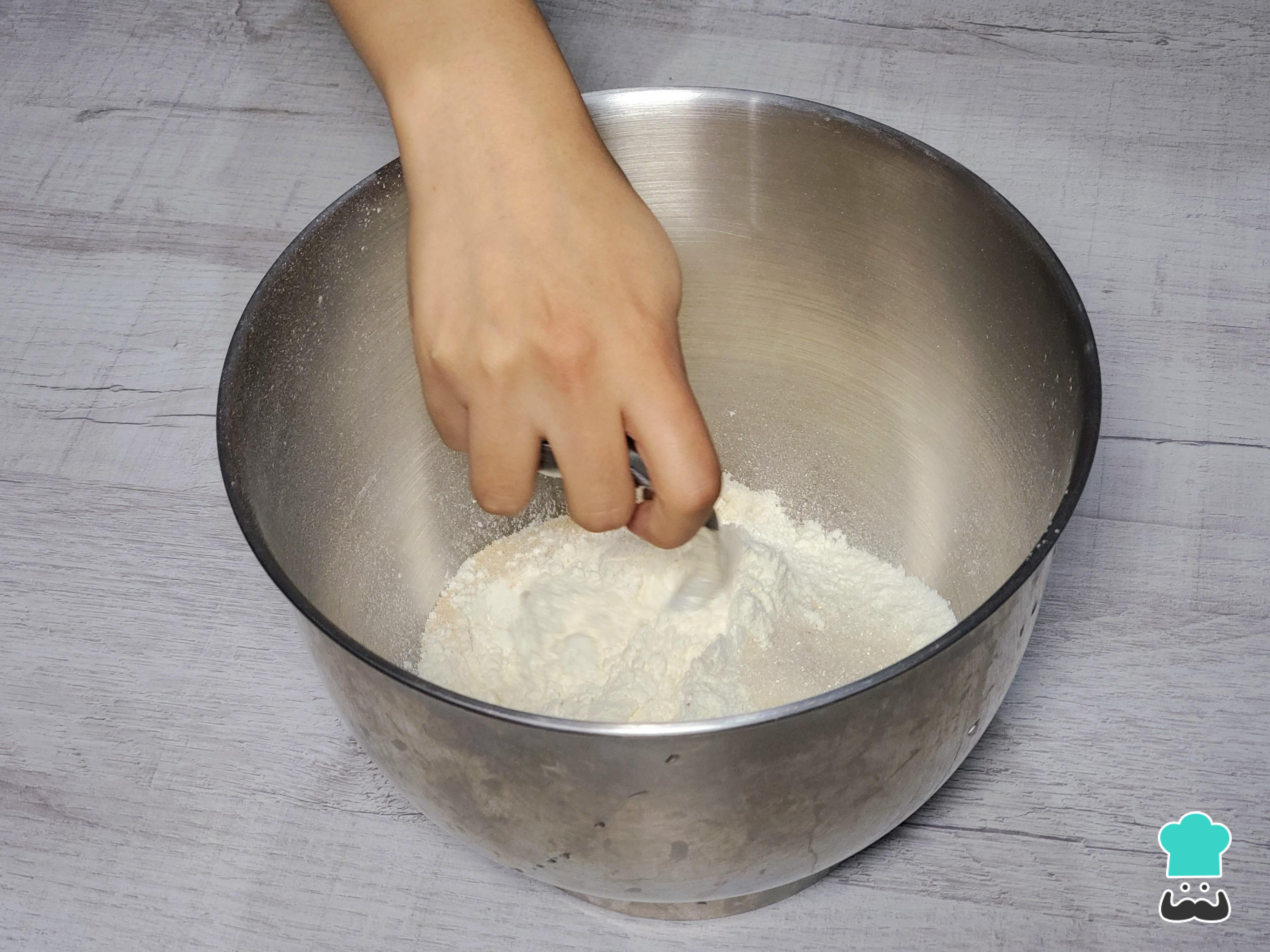 Comienza colocando en el bowl de la batidora todos los ingredientes secos: la harina, la sal, el azúcar y la levadura seca instantánea.