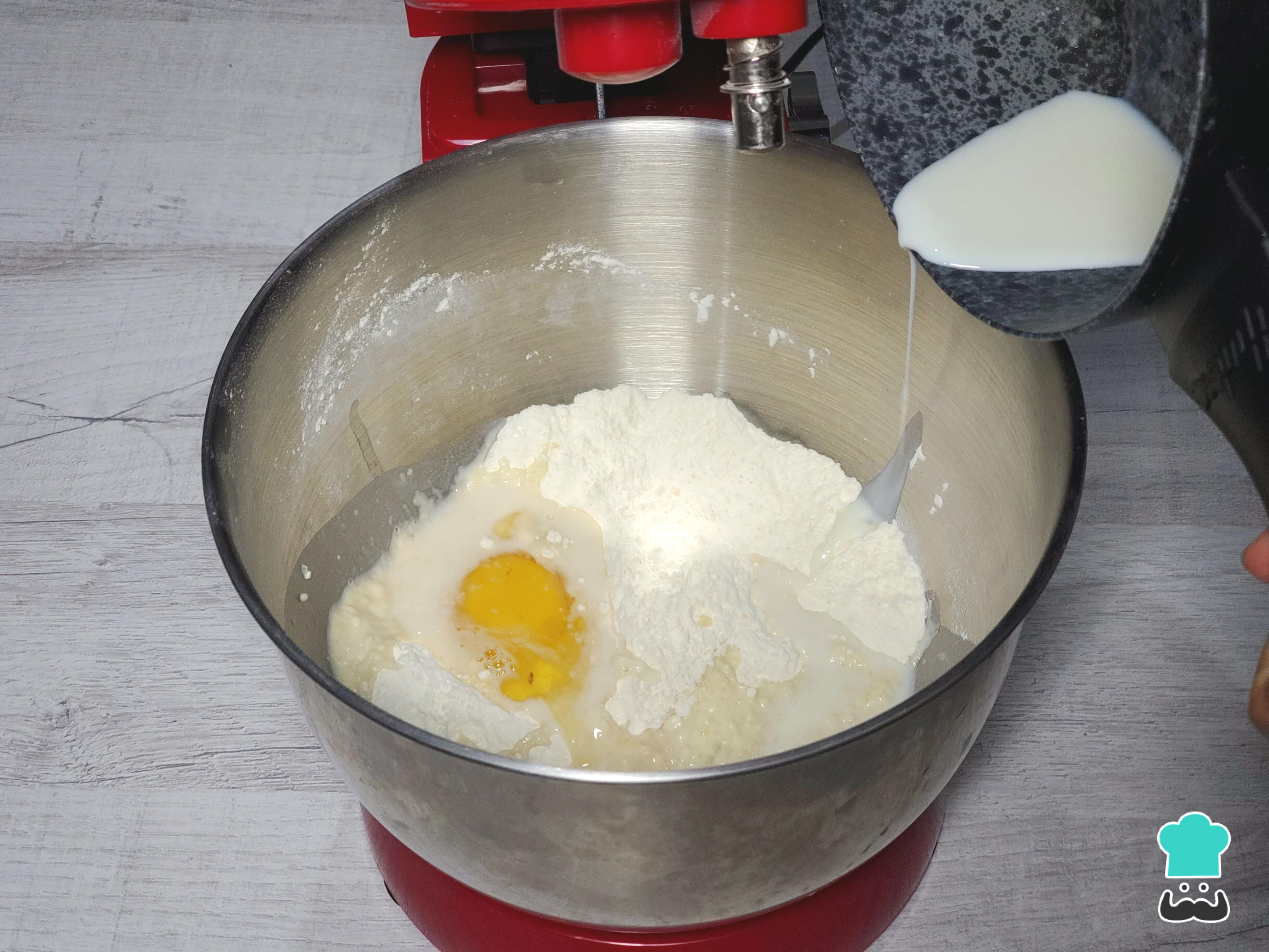 Mezcla brevemente con el accesorio de gancho para pan. Agrega luego los ingredientes líquidos: el huevo, la leche tibia (alrededor de 40 °C) y el puré de papa. Empieza a batir a velocidad media hasta que todo se integre bien.