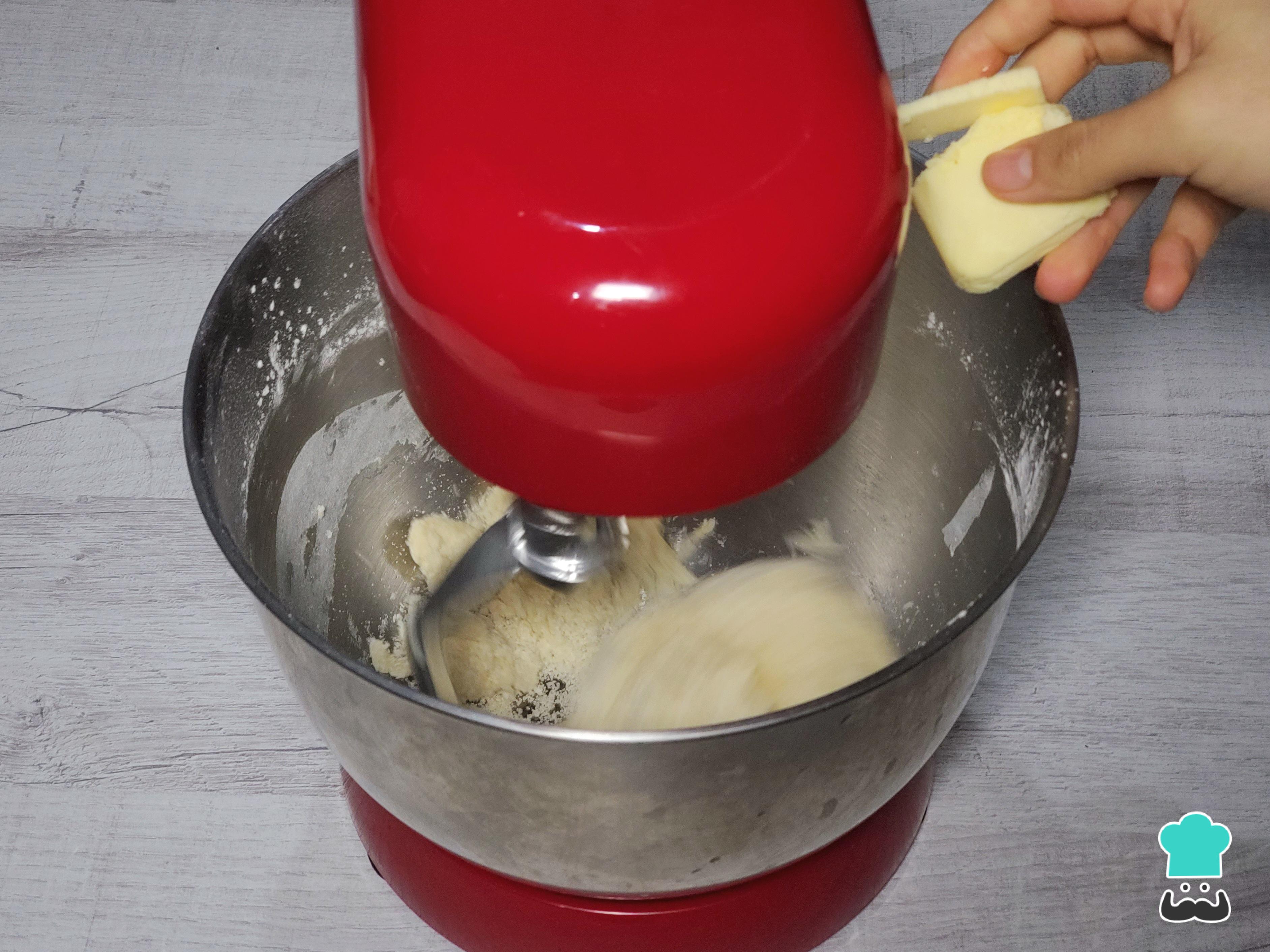 Incorpora la mantequilla en cubos y aumenta la velocidad al máximo para amasar.