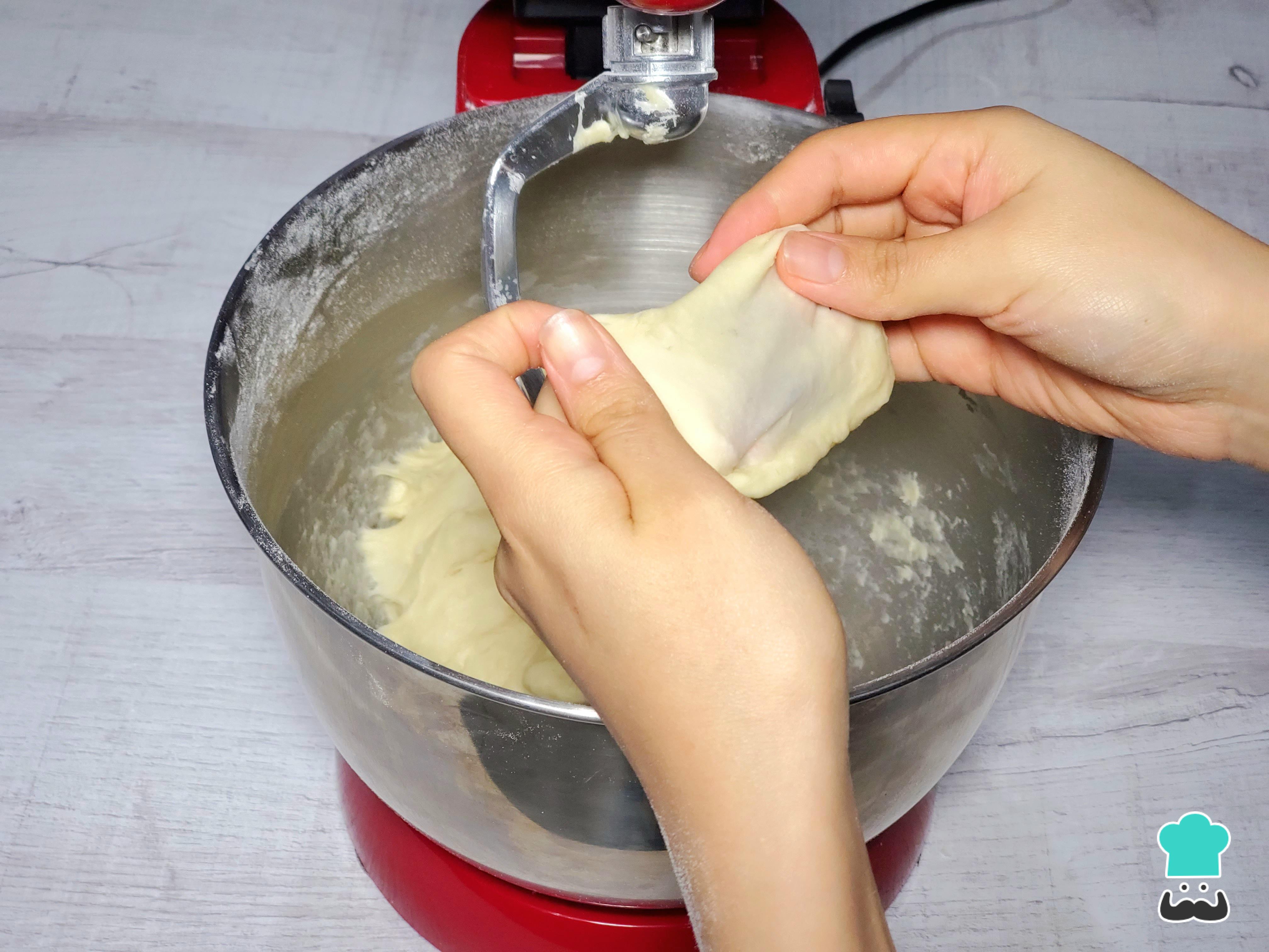 Después de unos 10 minutos de amasado continuo, detén la batidora y verifica si se ha desarrollado el gluten: toma una porción de masa y estírala suavemente; si se forma una película translúcida que no se rompe con facilidad, está lista para bolear. Si no, continúa amasando un poco más.