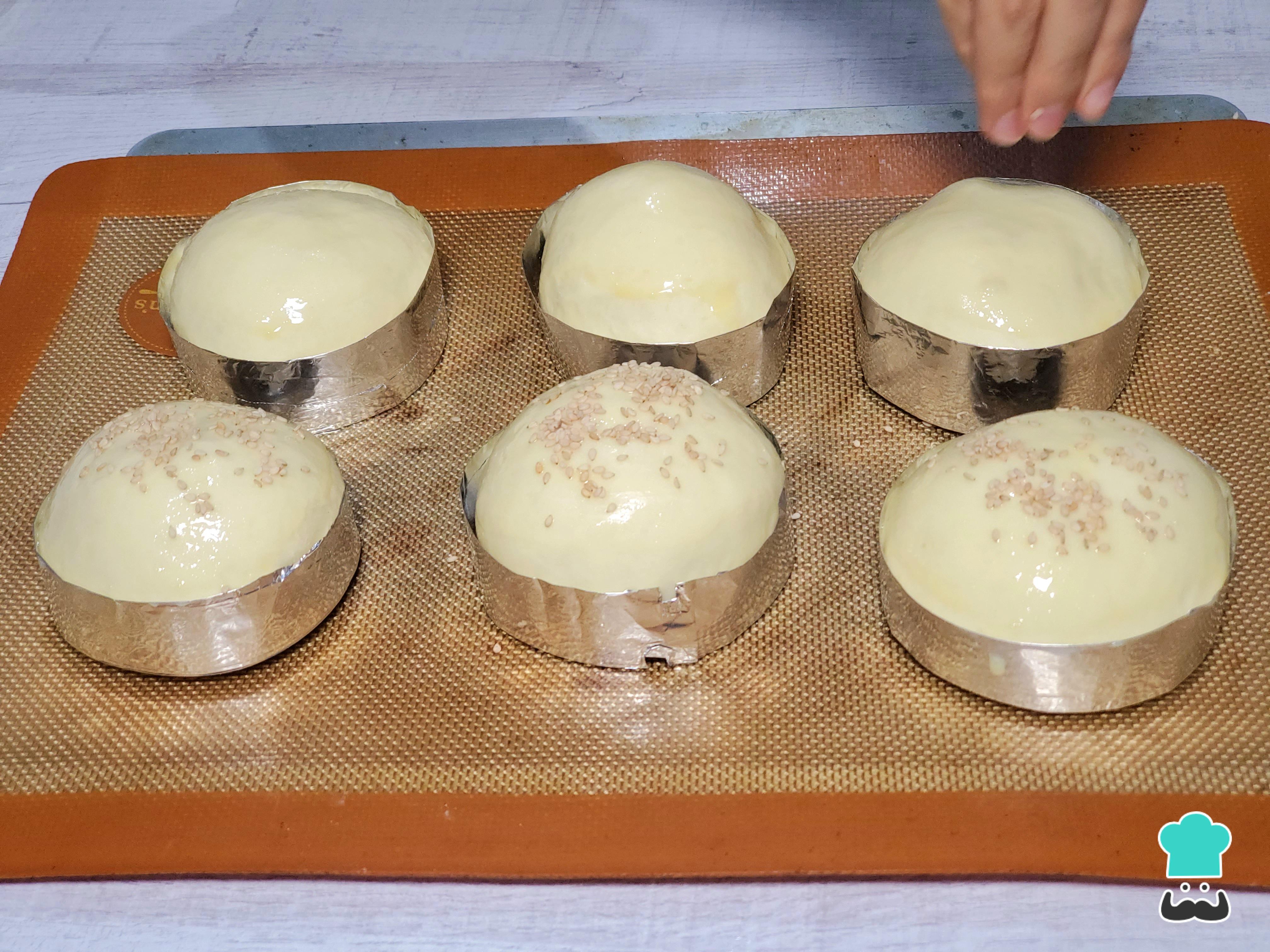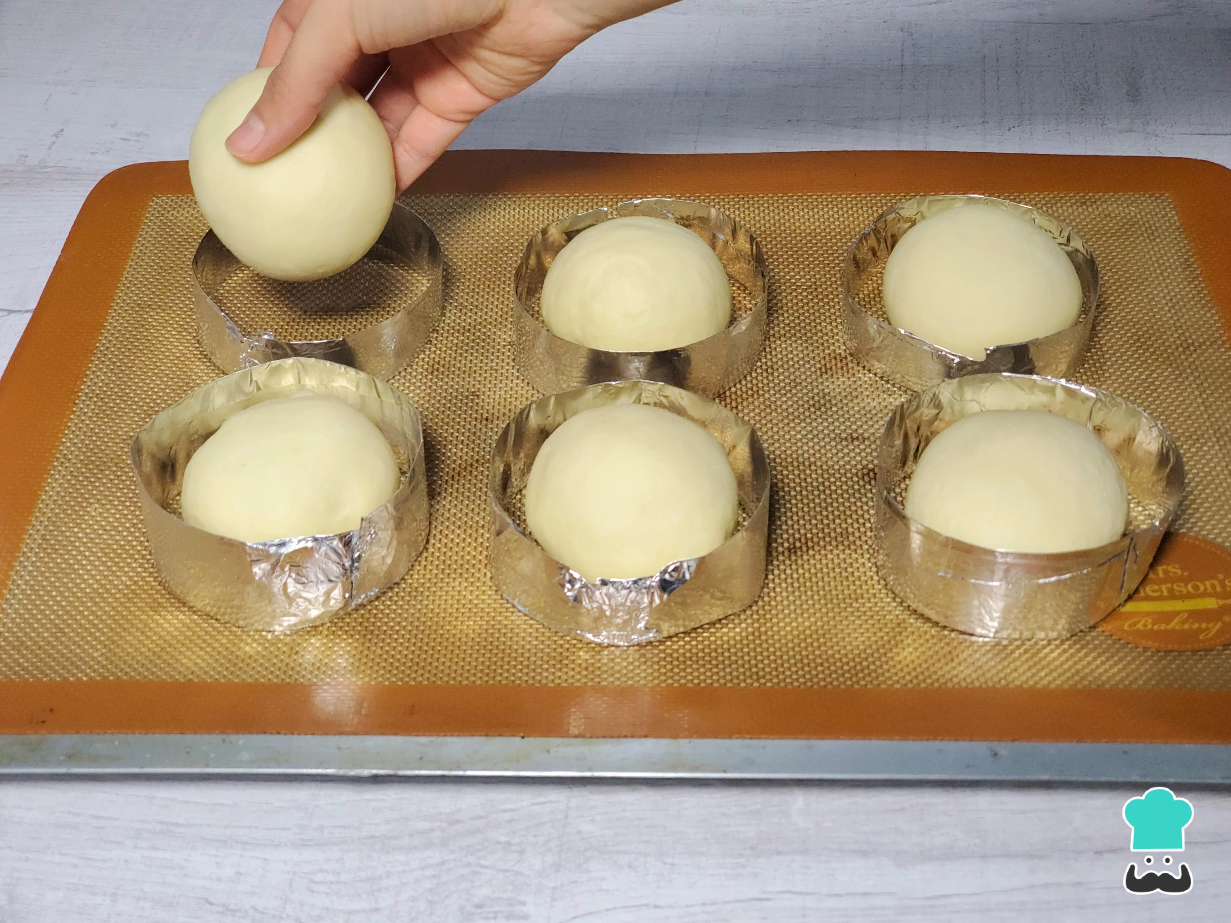 Coloca cada masita dentro de un aro, cúbrelos con un paño húmedo o film y deja que leuden nuevamente hasta duplicar su volumen o hasta casi llenar el aro.