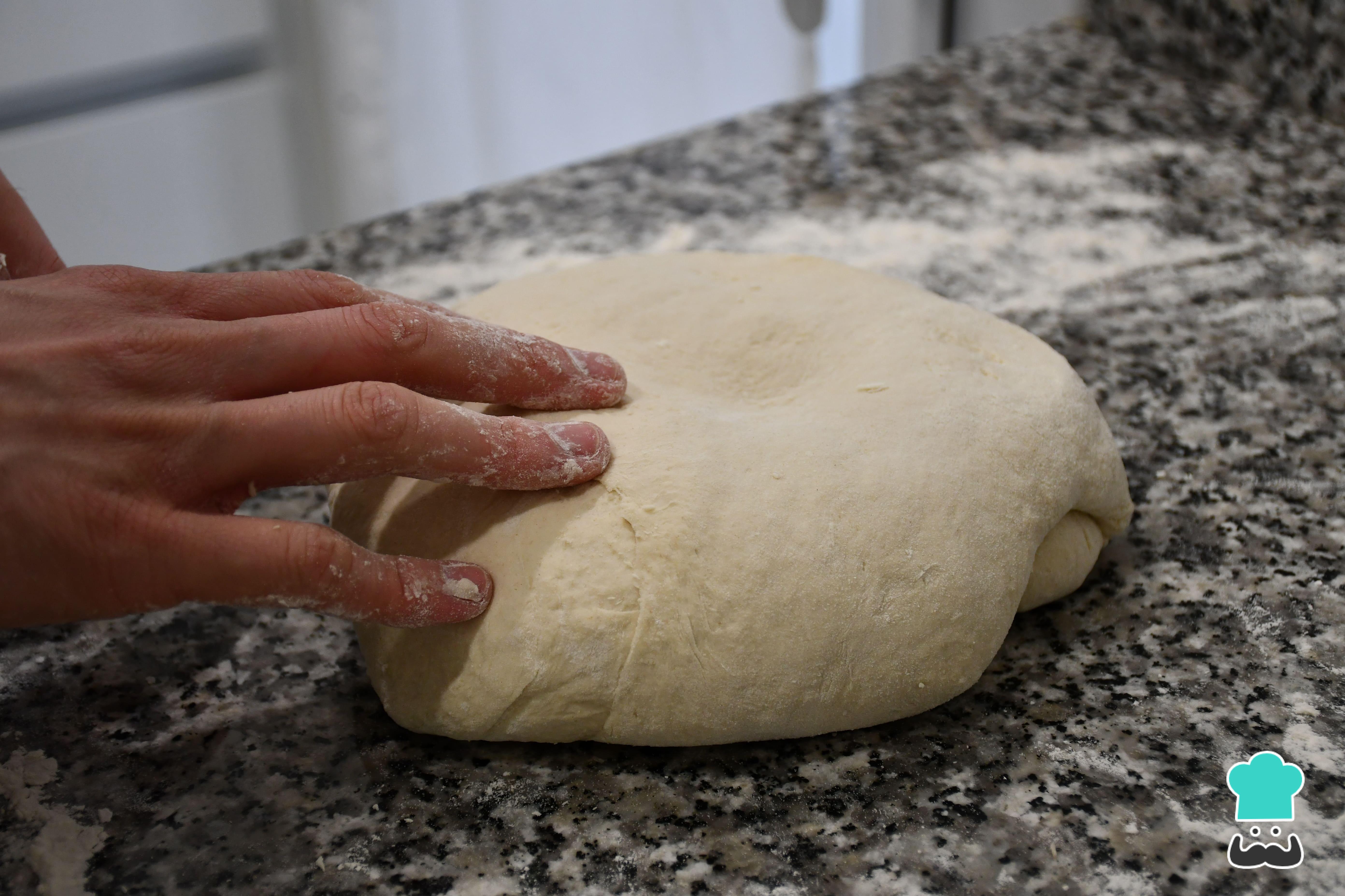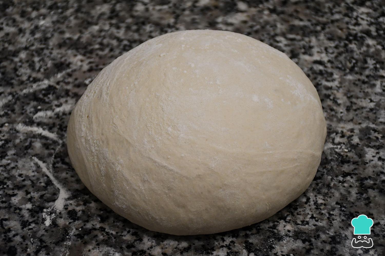 Cuando la masa del pan de payés esté homogénea, pásala a una mesa enharinada y trabájala con las manos. Amasa durante 10 minutos estirando la masa y doblándola sobre sí misma para atrapar el aire. Pasados los 10 minutos, tápala con un paño de cocina y deja que repose 20 minutos. Repite este proceso 2 veces más.