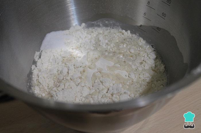 Vertemos en el bol de la harina tamizada la levadura disuelta en el agua y las cucharaditas de sal. Amasamos durante 10 minutos dejando una masa lisa y elástica.