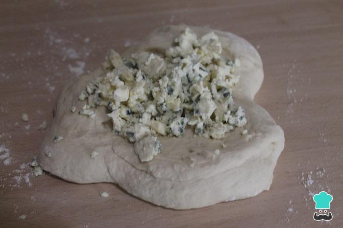 Pasado el primer tiempo de levado, vamos a enharinar ligeramente una superficie de trabajo y rompemos la masa varias veces. Estiramos la masa con las manos y desmenuzamos encima el queso roquefort. Amasamos durante dos minutos hasta que el queso esté completamente integrado en la masa del pan casero.