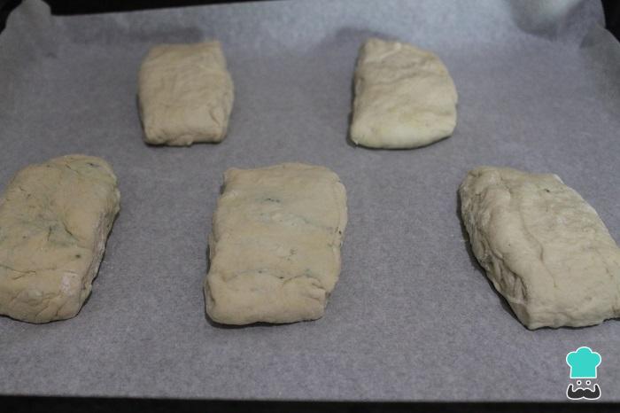 Forramos una bandeja con papel de horno. Cortamos la masa en cinco partes más o menos iguales y formamos unos panecillos de queso rectangulares. Los ponemos en la bandeja preparada, los tapamos de nuevo con un paño, y los dejamos reposar durante 2 horas en un lugar cálido y sin corrientes de aire.