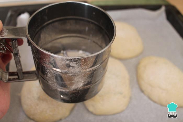 Pasado este nuevo tiempo de reposo, precalentamos el horno a 210 ºC. Ponemos un bol con agua en la base del horno para hornear los panecillos con humedad. Tamizamos la cucharada de harina encima de nuestros panes de roquefort y los horneamos durante 25 minutos con calor arriba y abajo a 210 ºC.