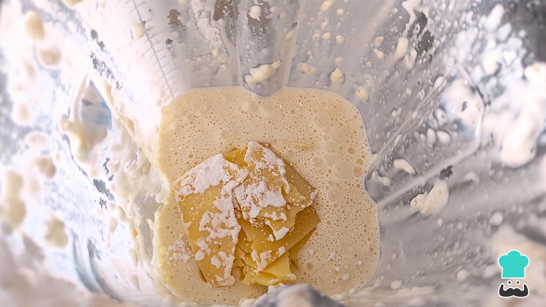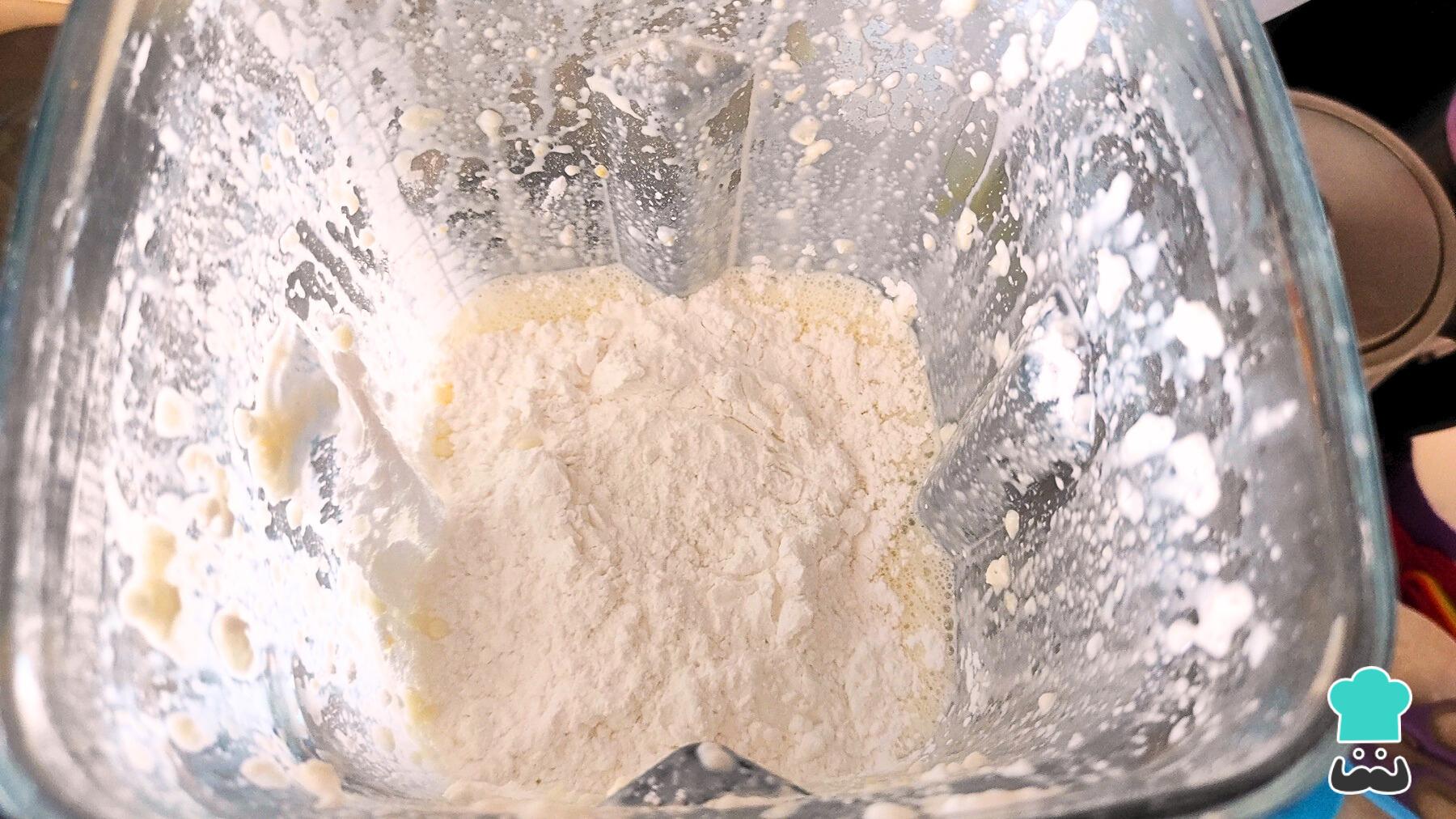 Añade la harina de tapioca triturando entre taza y taza. Es muy importante que la harina de tapioca se añada por encima de la preparación líquida, ya que si se realiza al revés, se formará una masa que evitará que las aspas de la licuadora giren, quemándola.