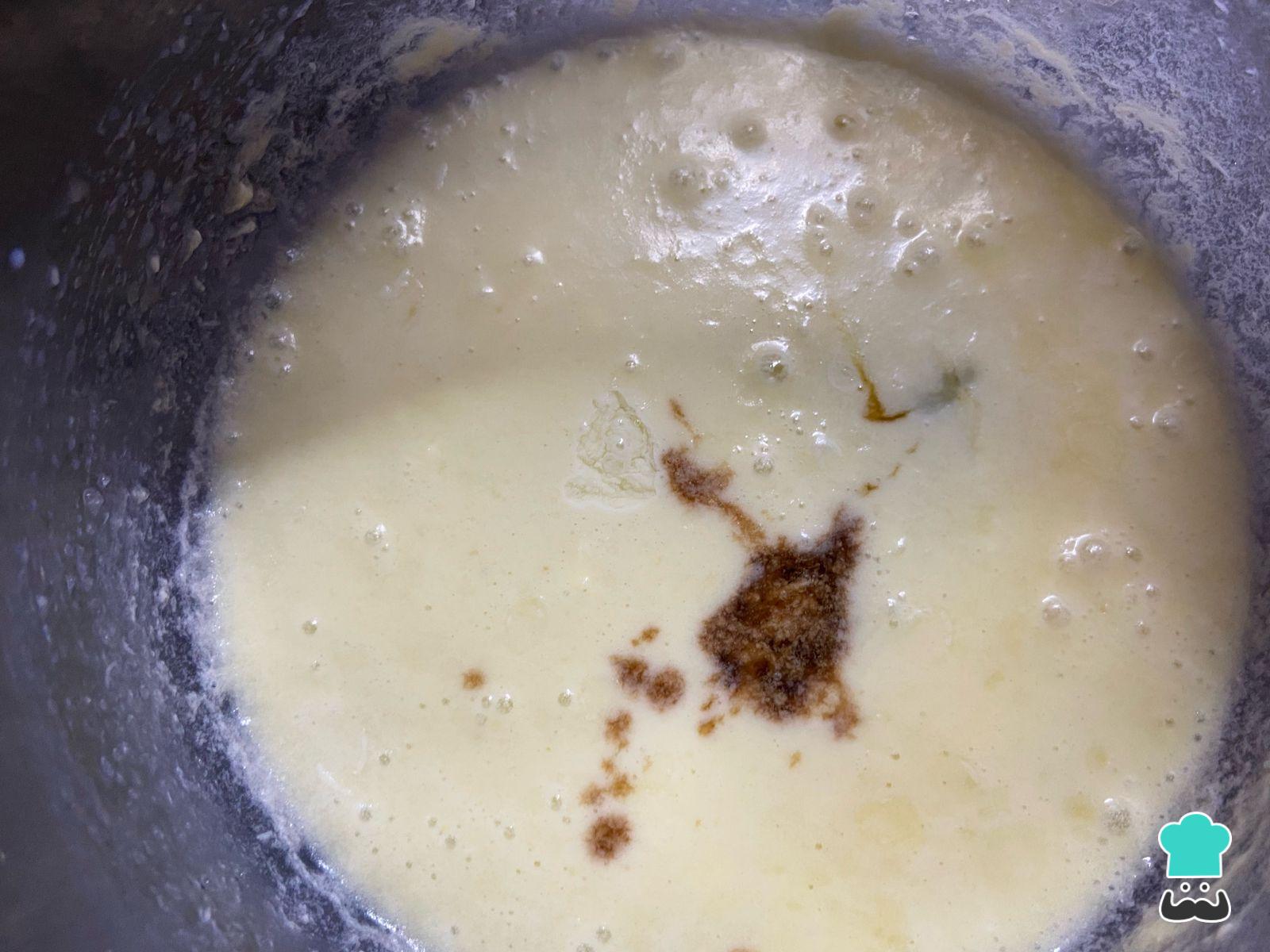 Incorpora la leche, la esencia de vainilla, el extracto de malta y el agua de azahar. Bate nuevamente para integrar.