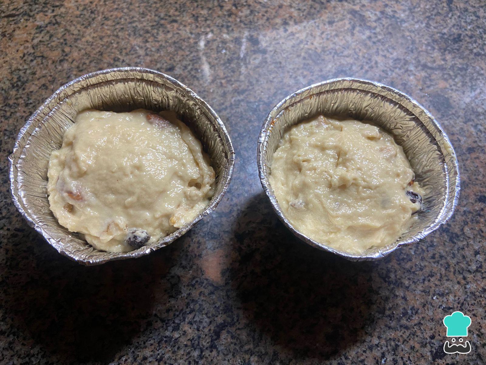 Coloca la masa para pan dulce en los moldes con la ayuda de una cuchara y lleva al horno precalentado a 180°C durante 30 minutos. Verifica si el pan dulce está cocido introduciendo un palillo en el centro. Estará listo, cuando salga seco.
