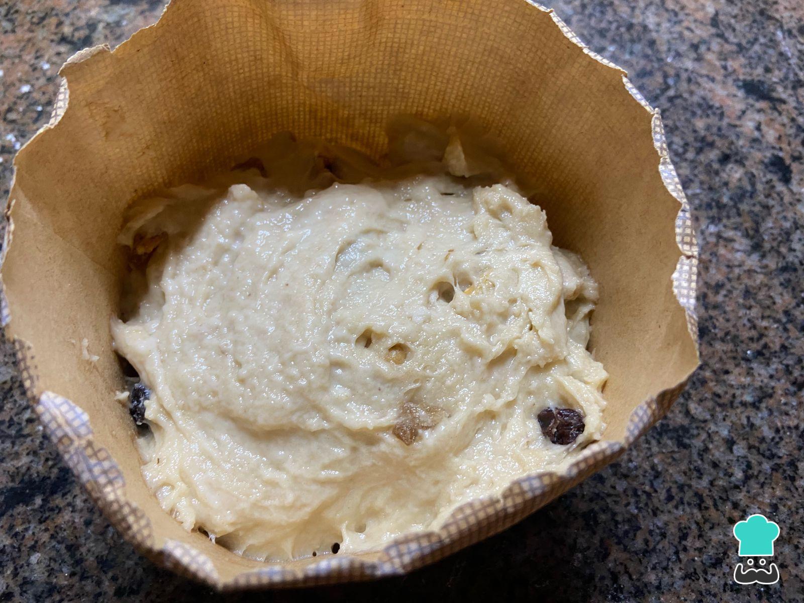 Coloca la masa en el molde de pan dulce con aceite, ayúdate con espátula, cuchara o cornet. Distribuye bien por todo el molde y deja levar nuevamente por 40 minutos. Cuando hayan transcurrido 30 minutos, enciende el horno para precalentarlo a 180 °C.