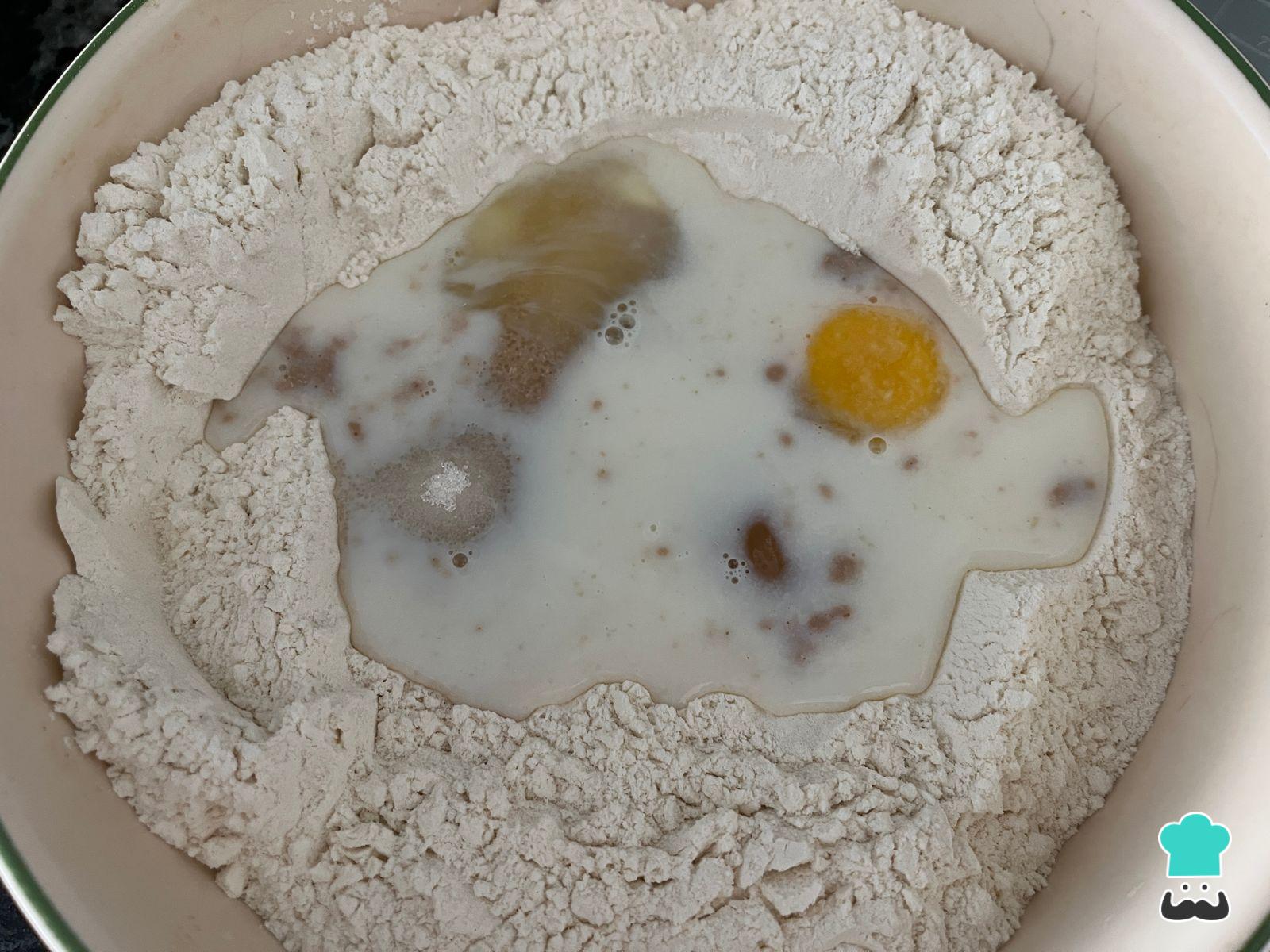 Para empezar con la preparación del pan de Navidad casero en un recipiente dispón la harina mezclada con el azúcar. Haz un hueco en el centro y añade la leche tibia, la miel, el huevo a temperatura ambiente, la levadura y las esencias. Puedes reemplazar la esencia de pan dulce por ralladura de limón o de naranja.