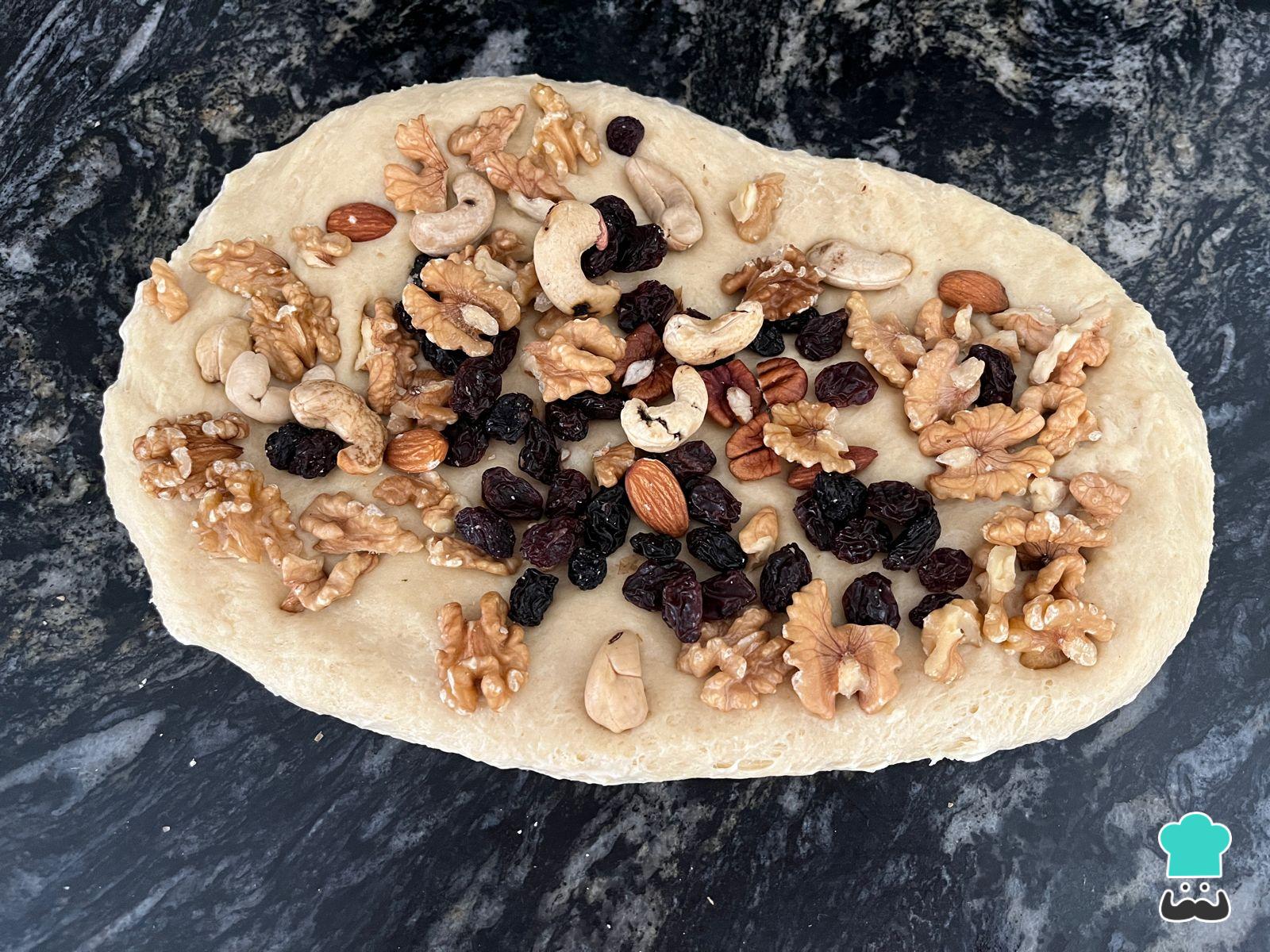Pasado el tiempo, estira la masa de forma rectangular y añade los frutos secos. Integra sin amasar demasiado o se romperá el gluten que formamos al amasar.