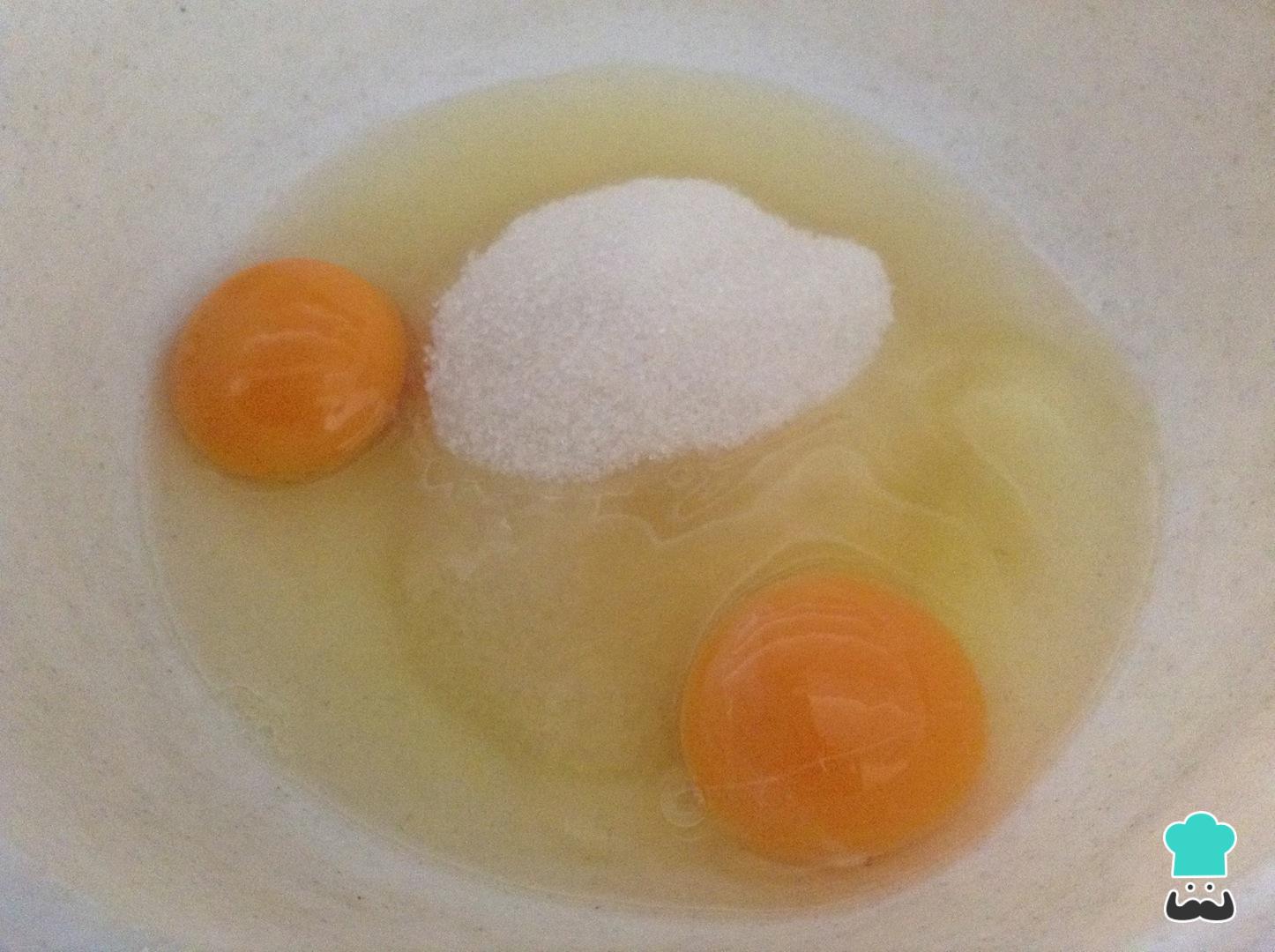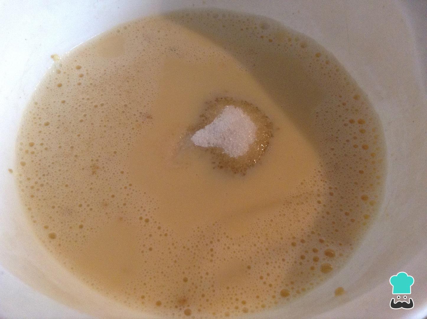 En un bol aparte mezcla el azúcar blanco, los huevos y la pizca de sal. Bate bien todos los ingredientes.
