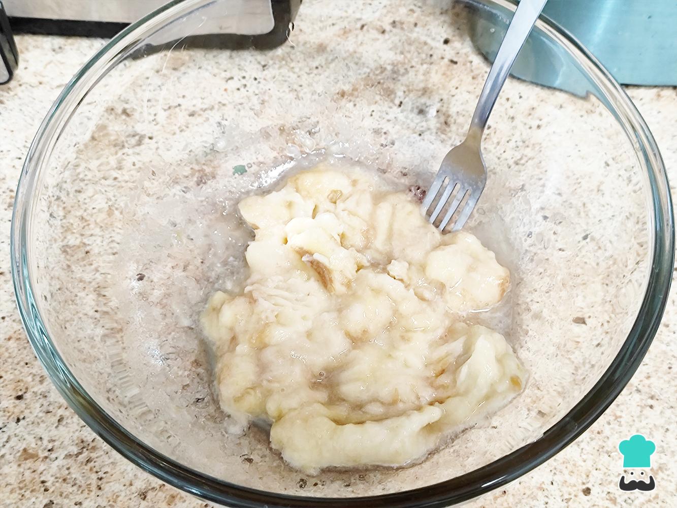 Machaca los plátanos en un bowl grande hasta obtener un puré cremoso. Puedes usar plátano maduro o plátano dominico para un sabor más dulce.