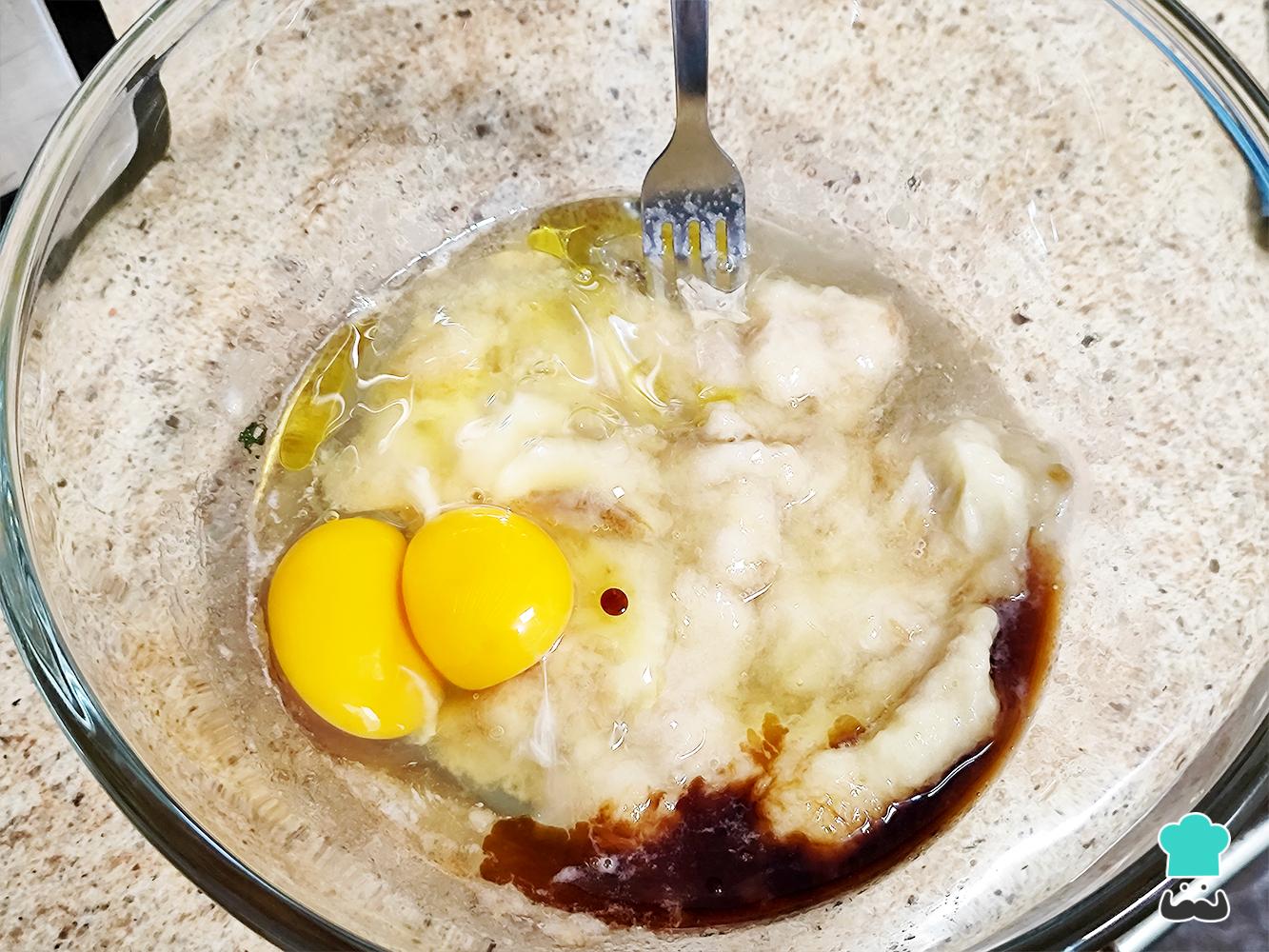 Añade los huevos, el azúcar, la vainilla y el aceite. Mezcla bien hasta integrar.