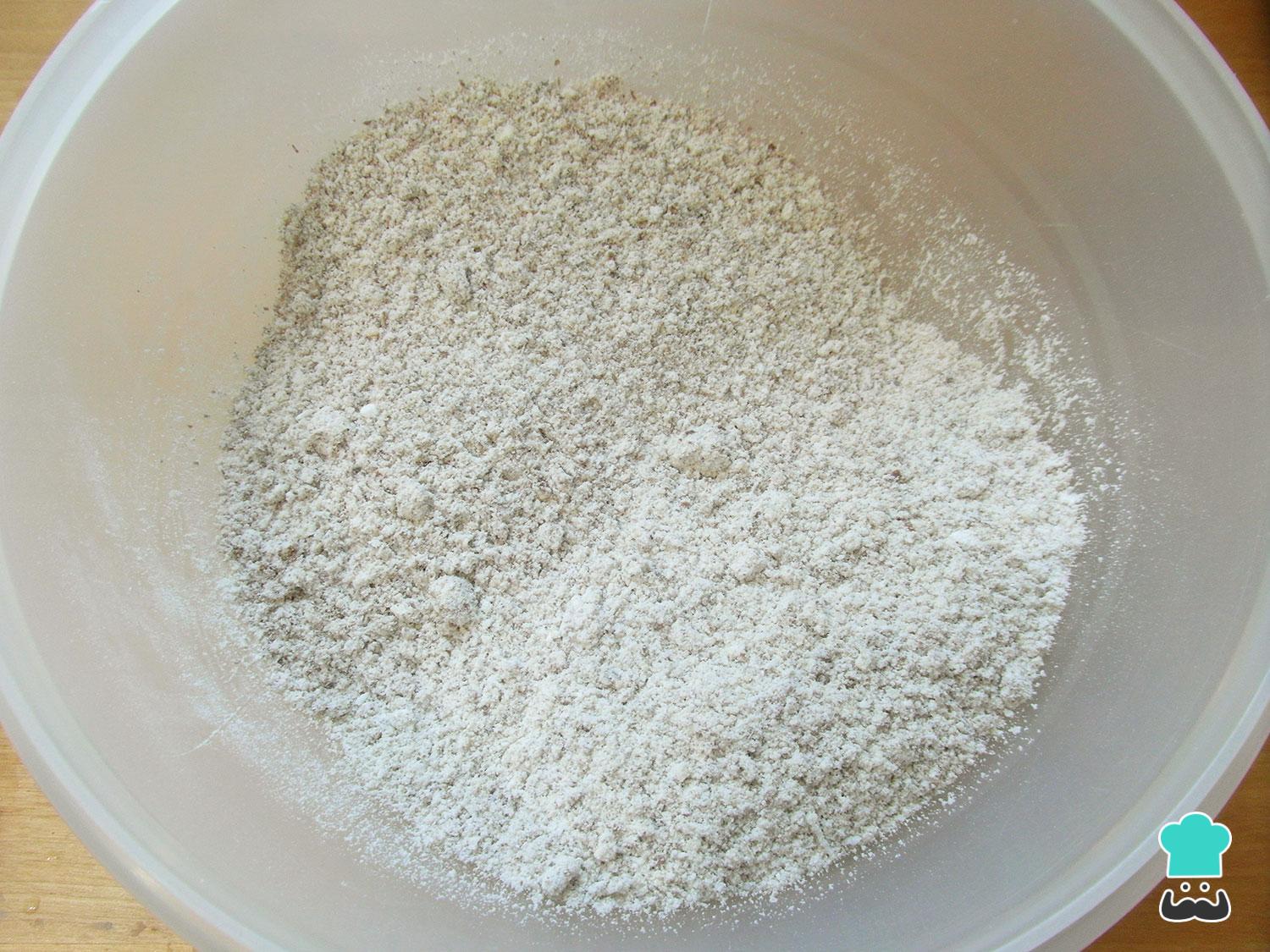 En un bol mezclar todos los ingredientes secos delpan bajo en carbohidratos: la linaza molida, la harina de coco, la harina de almendra, la harina de yuca, la levadura química o polvos de hornear y la sal.
