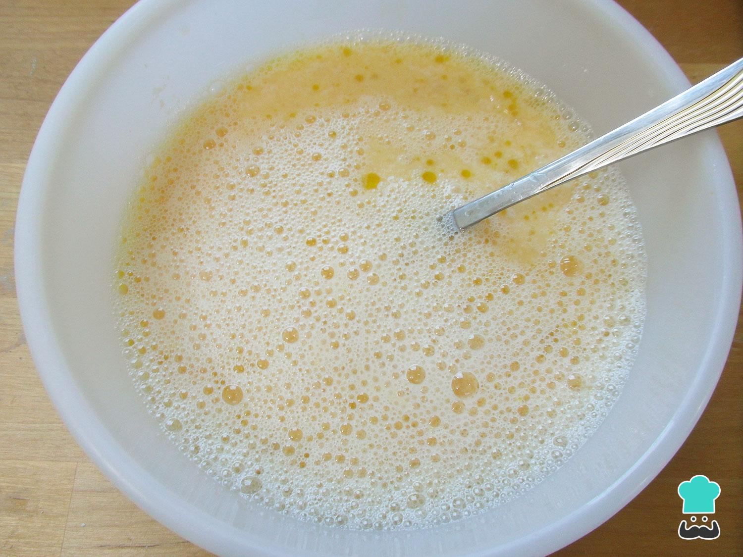 En otro bol batir los huevos y añadir el agua, la leche, el aceite de oliva y el vinagre. Mezclar todo junto y añadir a los ingredientes secos del pan paleo de almendras.